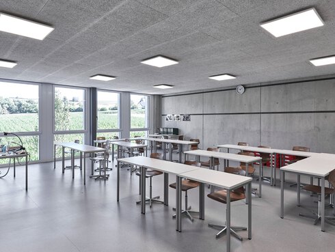 Schülerinnen und Schüler benötigen 500 Lux Beleuchtungsstärke, um dem Unterricht ermüdungsfrei folgen zu können. Leuchten mit UGR < 16/19 vermeiden störende Blendung – die Augen ermüden bei fortgeschrittener Uhrzeit nicht so schnell. Im Fokus einer guten Klassenzimmerbeleuchtung liegt nach wie vor die Illumination der Tafel. Ob die klassische Tafel oder das moderne Whiteboard, diese Fläche sollte mit 500 Lux, bei hoher Gleichmäßigkeit (0,7) beleuchtet werden, um auch in der letzten Bankreihe noch eine optimale Wahrnehmung und Lesbarkeit zu garantieren. Bei Präsentationen ist es wiederum sinnvoll, die Beleuchtungsanlage zu dimmen, oder nur Teilbereiche des Raumes zu beleuchten. Vorprogrammierte Szenen können beispielsweise über ein Lichtmanagementsystem abgerufen werden und somit wechselnde Unterrichtsformate unterstützen.