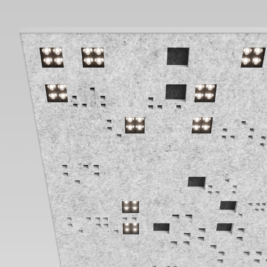 Leuchtenkörper aus hochwertigem, selbsttragenden, mind. 50 % recycelten PET-Filz mit schallabsorbierenden Eigenschaften; optisch und haptisch hochwertige Oberfläche; Aufbau aus zwei Lagen, mit umlaufendem Aluminiumstrangpressprofil; große schallabsorbierende Oberfläche; abgependelt mit Seilabhängung; werkzeuglose Höhenverstellung; inkl. Einspeiseleitung; an die Natur angelehntes, fraktales Code-Lochmuster, wissenschaftlich entwickelt, um Stress zu reduzieren; im Code-Lochmuster integrierte Lichteinsätze; bestückt mit LED Einzellichtpunkten; gute Entblendung durch zurückversetzte Lichtpunktebene; trotzdem erhöhte Effizienz durch spezielle Linsentechnik; eingesetzte Linsen mit wide flood Abstrahlcharakteristik; optimiert zur Ausleuchtung von Büroarbeitsplätzen; energieeffiziente LEDs mit sehr guter Farbwiedergabe