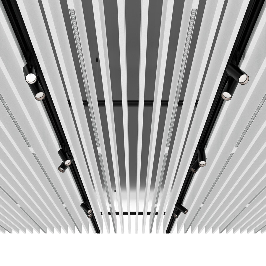 Flexibles Montagesystem zur Abhängung mehrerer Baffles und Leuchten; bestehend aus Aluminiumprofilen, dreh- und verschiebbaren Montageclips aus 3D-Druck und Akustikelementen aus 25 mm starkem, hochwertigem, selbsttragendem, mind. 50 % recyceltem PET-Filz mit schallabsorbierenden Eigenschaften; optisch und haptisch hochwertige Oberfläche; linearer Lichteinsatz aus Kunststoff im Aluminiumstrangpressprofil; Oberfläche pulverbeschichtet; hochwertiger Reflektor mit mikrofacettierter, aluminiumbedampfter Oberfläche; präzise Abstrahlcharakteristik mit symmetrischer Lichtverteilung; Konverter im Modul integriert; inkl. Einspeiseleitung, wahlweise mit 3-Phasenadapter; Abstand zwischen den Baffles bzw. Leuchten frei wählbar; abgependelt mit Seilabhängung; werkzeuglose Höhenverstellung am Profil; mittels Linearverbinder beliebig erweiterbar; optional: MOVE IT PRO track mittels Zubehör integrierbar