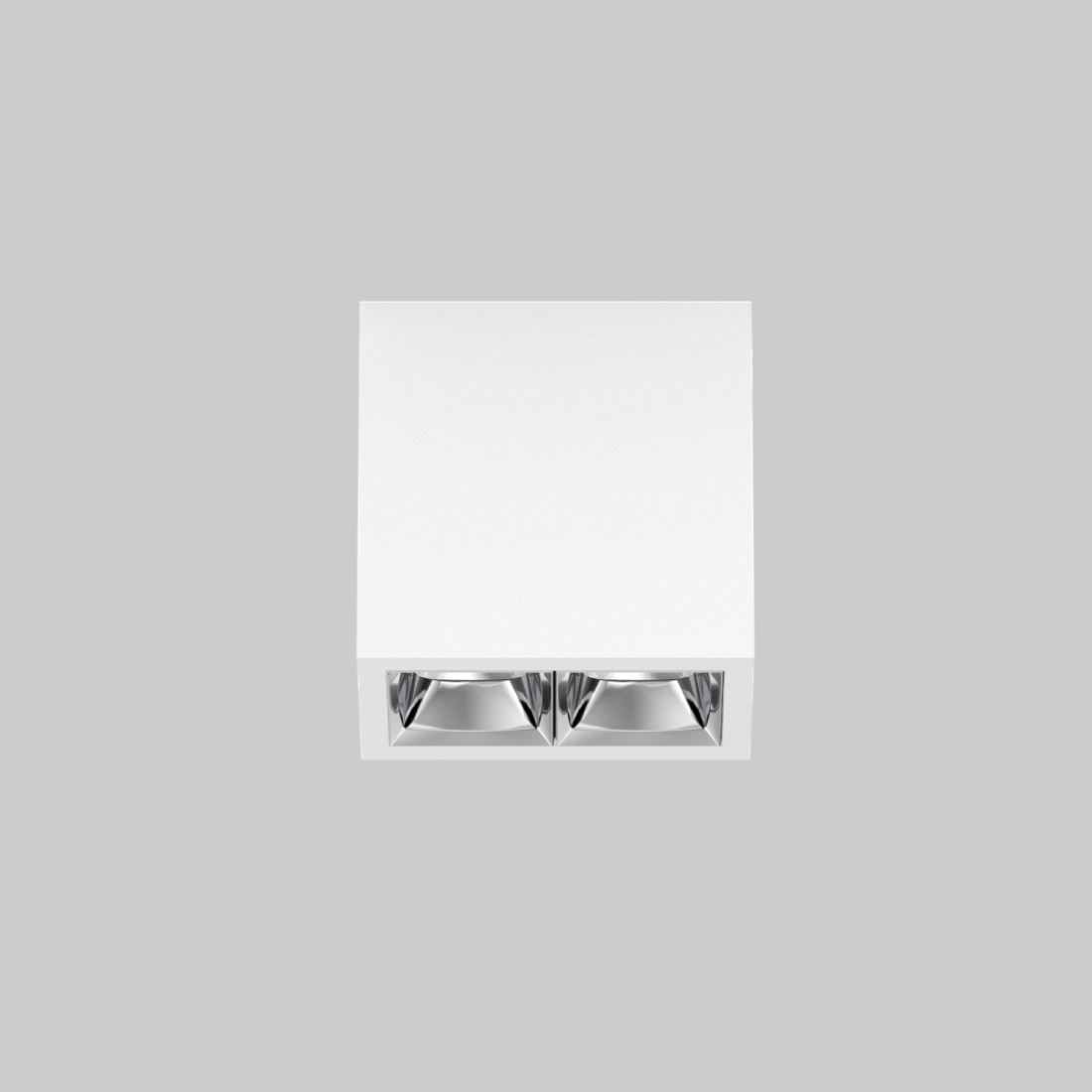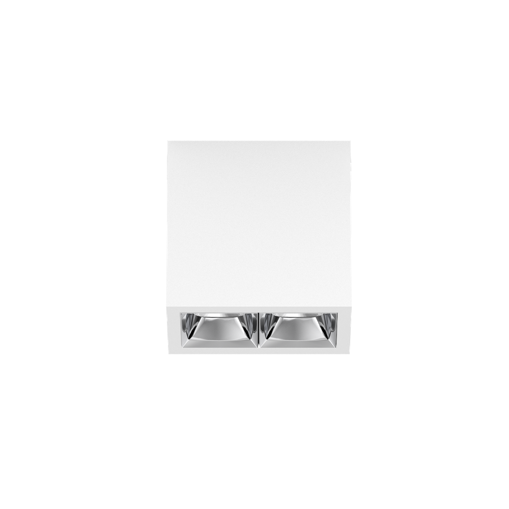 Rechteckiger Anbau-Multi-Downlight aus Aluminium; Leuchtenkörper mittels Verriegelung werkzeuglos auf Montageplatte aufsetzbar; Konverter im Leuchtenkörper integriert; Oberfläche Verkehrsweiß pulverbeschichtet; bestückt mit zwei spot round Optiken; symmetrische Lichtverteilung mit präziser Abstrahlcharakteristik, Ausstrahlwinkel 15°; hochwertiger Reflektor mit mikrofacettierter, aluminiumbedampfter Oberfläche; Reflektor Chrom; UGR ≤ 10; bildschirmtaugliche Arbeitsplatzleuchte nach DIN EN 12464-1; Leuchtdichte über 65° ≤ 1500 cd/m²; passive Kühlung der LEDs durch optimierte Kühlkörpergeometrie; Lichtfarbe 2700 K; ≤ 3 SDCM (initial MacAdam); CRI ≥ 90; min. 90% des Lichtstromes nach 50000 h Lebensdauer; energieeffiziente High-Power-LEDs mit sehr guter Farbwiedergabe; Schutzart IP20; SK1; 220-240 V; inkl. Konverter, nicht dimmbar; nicht austauschbare Lichtquelle; Betriebsgerät durch autorisierte Fachleute austauschbar; klirrfrei;