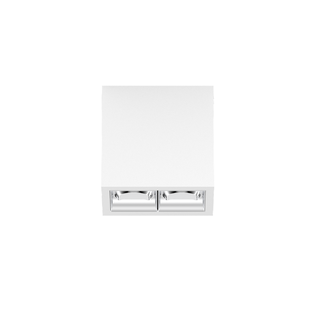 Rechteckiger Anbau-Multi-Downlight aus Aluminium; Leuchtenkörper mittels Verriegelung werkzeuglos auf Montageplatte aufsetzbar; Konverter im Leuchtenkörper integriert; Oberfläche Verkehrsweiß pulverbeschichtet; bestückt mit zwei wallwasher Optiken; asymmetrische Lichtverteilung mit präziser Abstrahlcharakteristik; hochwertiger Reflektor mit mikrofacettierter, aluminiumbedampfter Oberfläche; Reflektor Chrom; passive Kühlung der LEDs durch optimierte Kühlkörpergeometrie; Lichtfarbe 2700 K; ≤ 3 SDCM (initial MacAdam); CRI ≥ 90; min. 90% des Lichtstromes nach 50000 h Lebensdauer; energieeffiziente High-Power-LEDs mit sehr guter Farbwiedergabe; Schutzart IP20; SK1; 220-240 V; inkl. Konverter, nicht dimmbar; nicht austauschbare Lichtquelle; Betriebsgerät durch autorisierte Fachleute austauschbar; klirrfrei;