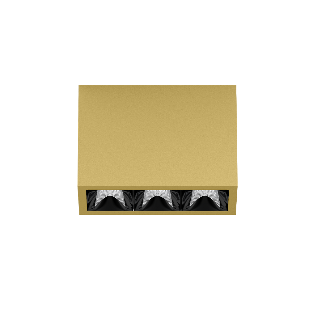 Rechteckiger Anbau-Multi-Downlight aus Aluminium; Leuchtenkörper mittels Verriegelung werkzeuglos auf Montageplatte aufsetzbar; Konverter im Leuchtenkörper integriert; Oberfläche Goldstaub pulverbeschichtet; bestückt mit drei wide flood round Optiken; symmetrische Lichtverteilung mit präziser Abstrahlcharakteristik, Ausstrahlwinkel 72°; hochwertiger Reflektor mit mikrofacettierter, aluminiumbedampfter Oberfläche; Reflektor Schwarz; passive Kühlung der LEDs durch optimierte Kühlkörpergeometrie; Lichtfarbe 4000 K; ≤ 3 SDCM (initial MacAdam); CRI ≥ 90; min. 90% des Lichtstromes nach 50000 h Lebensdauer; energieeffiziente High-Power-LEDs mit sehr guter Farbwiedergabe; Schutzart IP20; SK1; 220-240 V; inkl. Konverter, nicht dimmbar; nicht austauschbare Lichtquelle; Betriebsgerät durch autorisierte Fachleute austauschbar; klirrfrei;