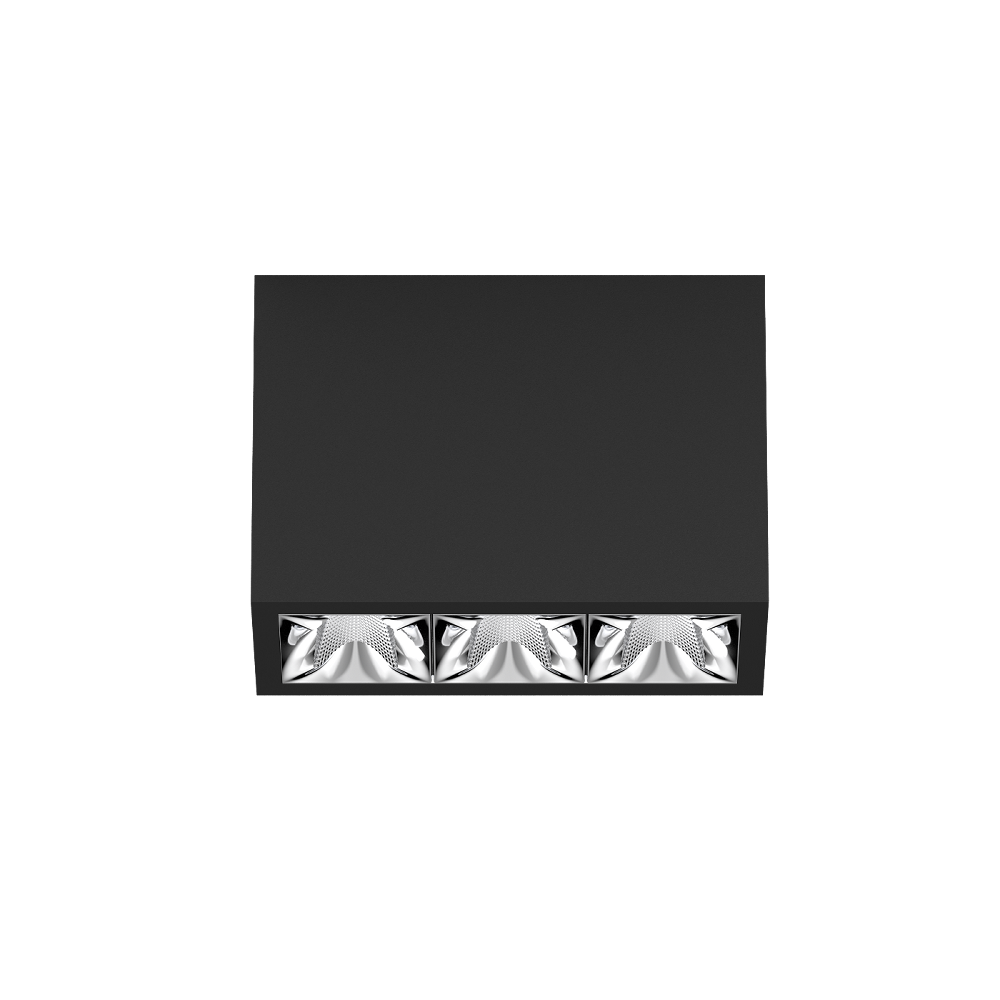 Rechteckiger Anbau-Multi-Downlight aus Aluminium; Leuchtenkörper mittels Verriegelung werkzeuglos auf Montageplatte aufsetzbar; Konverter im Leuchtenkörper integriert; Oberfläche Tiefschwarz pulverbeschichtet; bestückt mit drei flood round Optiken; symmetrische Lichtverteilung mit präziser Abstrahlcharakteristik, Ausstrahlwinkel 49°; hochwertiger Reflektor mit mikrofacettierter, aluminiumbedampfter Oberfläche; Reflektor Chrom; UGR ≤ 19; passive Kühlung der LEDs durch optimierte Kühlkörpergeometrie; Lichtfarbe 2700 K; ≤ 3 SDCM (initial MacAdam); CRI ≥ 90; min. 90% des Lichtstromes nach 50000 h Lebensdauer; energieeffiziente High-Power-LEDs mit sehr guter Farbwiedergabe; Schutzart IP20; SK1; 220-240 V; inkl. DALI-2 Konverter; nicht austauschbare Lichtquelle; Betriebsgerät durch autorisierte Fachleute austauschbar; klirrfrei;