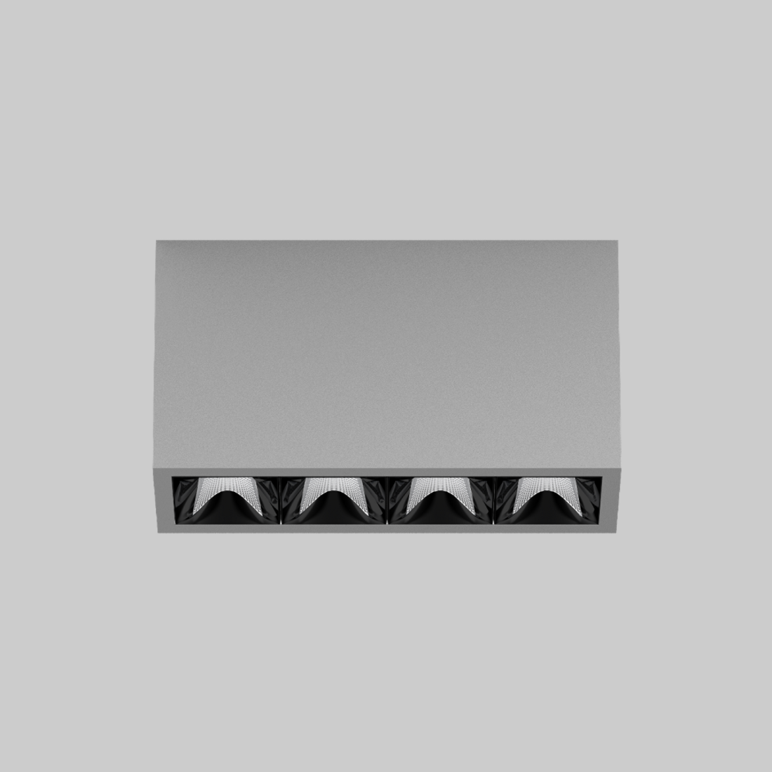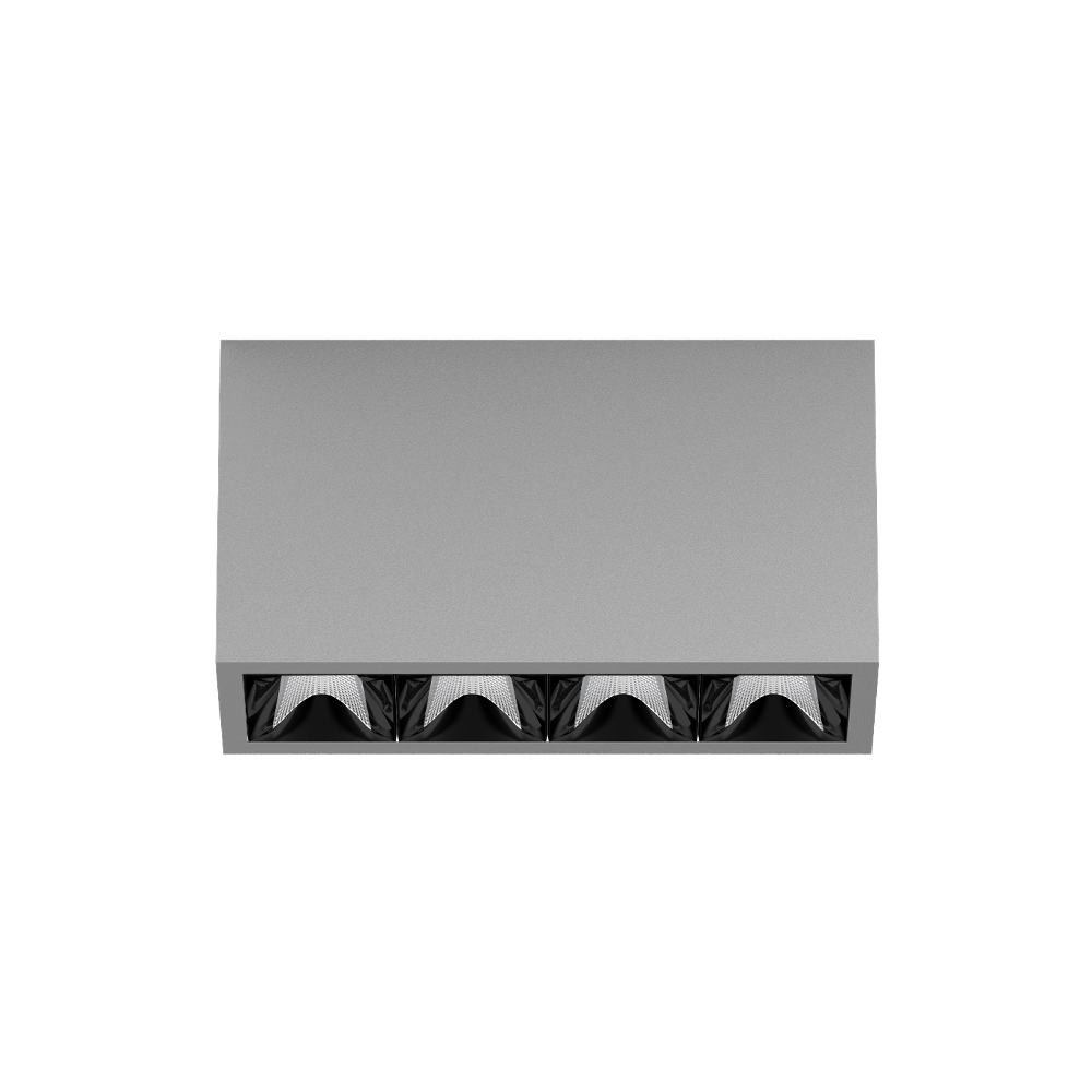 Rechteckiger Anbau-Multi-Downlight aus Aluminium; Leuchtenkörper mittels Verriegelung werkzeuglos auf Montageplatte aufsetzbar; Konverter im Leuchtenkörper integriert; Oberfläche Weiß Aluminium pulverbeschichtet; bestückt mit vier wide flood round Optiken; symmetrische Lichtverteilung mit präziser Abstrahlcharakteristik, Ausstrahlwinkel 72°; hochwertiger Reflektor mit mikrofacettierter, aluminiumbedampfter Oberfläche; Reflektor Schwarz; passive Kühlung der LEDs durch optimierte Kühlkörpergeometrie; Lichtfarbe 2700 K; ≤ 3 SDCM (initial MacAdam); CRI ≥ 90; min. 90% des Lichtstromes nach 50000 h Lebensdauer; energieeffiziente High-Power-LEDs mit sehr guter Farbwiedergabe; Schutzart IP20; SK1; 220-240 V; inkl. Konverter, nicht dimmbar; nicht austauschbare Lichtquelle; Betriebsgerät durch autorisierte Fachleute austauschbar; klirrfrei;