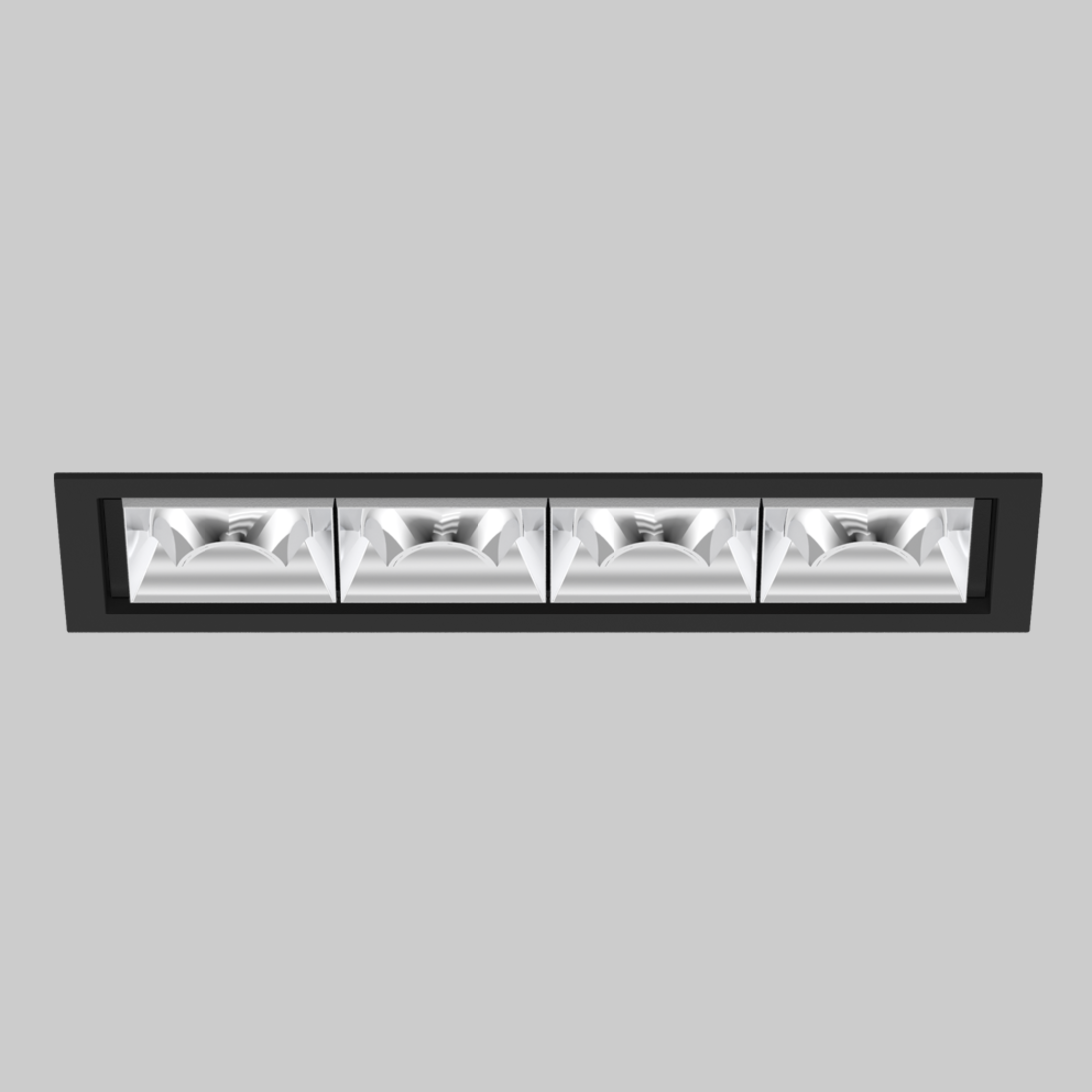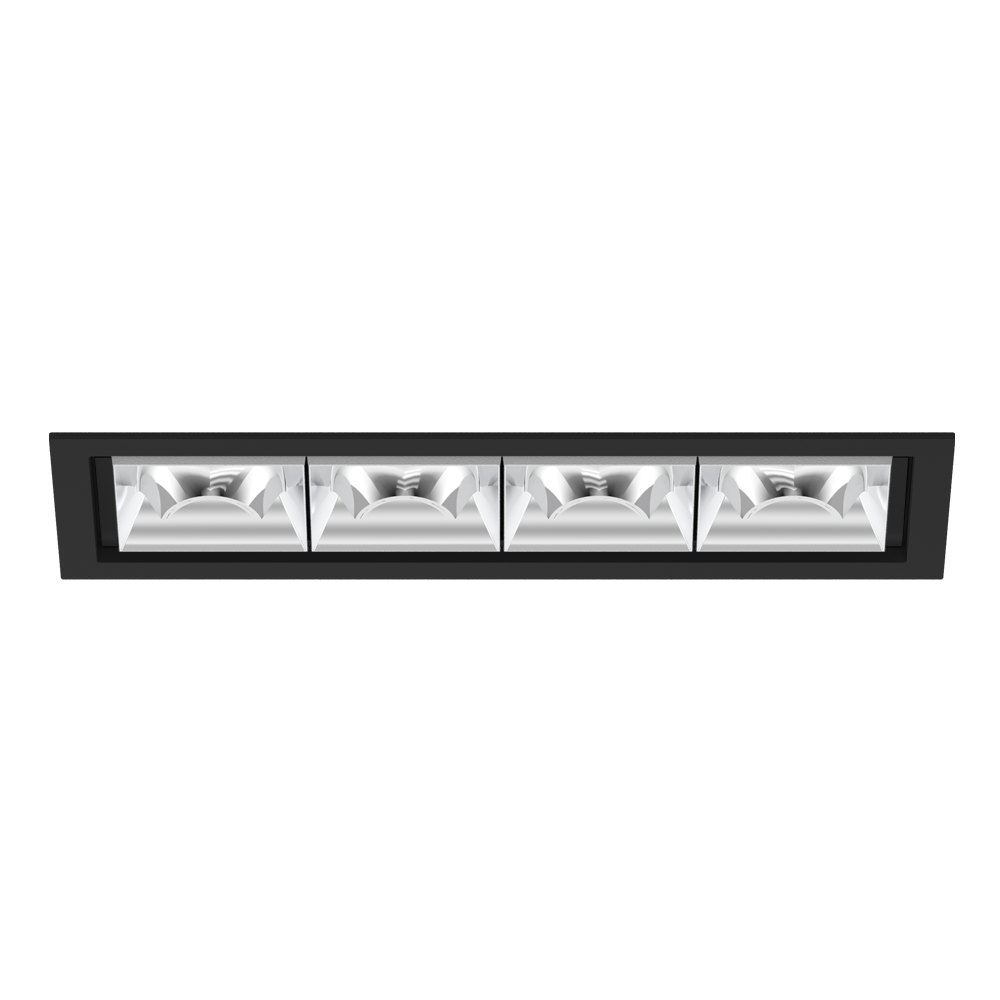 Rechteckiger Einbau-Multi-Downlight aus Aluminiumdruckguss; werkzeuglose Montage im Montageset durch patentiertes Kugelschnappsystem; rechteckiges Einbaugehäuse; mit umlaufendem Rand Tiefschwarz; geeignet für Deckenstärken von 2-25 mm; bestückt mit vier wallwasher floor Optiken; asymmetrische Lichtverteilung mit präziser Abstrahlcharakteristik; hochwertiger Reflektor mit mikrofacettierter, aluminiumbedampfter Oberfläche; Reflektor chrom; passive Kühlung der LEDs durch optimierte Kühlkörpergeometrie; Lichtfarbe 2700 K; ≤ 3 SDCM (initial MacAdam); CRI ≥ 90; min. 90% des Lichtstromes nach 50000 h Lebensdauer; energieeffiziente High-Power-LEDs mit sehr guter Farbwiedergabe; Schutzart IP20; SK2; 220-240 V; inkl. DALI-2 Konverter; Anschlussdose für Weiterverdrahtung, 3-polig oder 5-polig, als Zubehör erhältlich; Zubehör wird separat angeführt; nicht austauschbare Lichtquelle; Betriebsgerät durch autorisierte Fachleute austauschbar; klirrfrei;