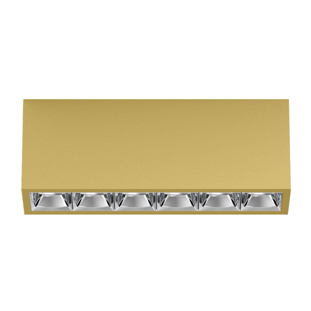 Rechteckiger Anbau-Multi-Downlight aus Aluminium; Leuchtenkörper mittels Verriegelung werkzeuglos auf Montageplatte aufsetzbar; Konverter im Leuchtenkörper integriert; Oberfläche Goldstaub pulverbeschichtet; bestückt mit sechs spot round Optiken; symmetrische Lichtverteilung mit präziser Abstrahlcharakteristik, Ausstrahlwinkel 15°; hochwertiger Reflektor mit mikrofacettierter, aluminiumbedampfter Oberfläche; Reflektor Chrom; UGR ≤ 10; bildschirmtaugliche Arbeitsplatzleuchte nach DIN EN 12464-1; Leuchtdichte über 65° ≤ 1500 cd/m²; passive Kühlung der LEDs durch optimierte Kühlkörpergeometrie; Lichtfarbe 4000 K; Binning initial MacAdam ≤ 3 SDCM; CRI ≥ 90; min. 90% des Lichtstromes nach 50000 h Lebensdauer; energieeffiziente High-Power-LEDs mit sehr guter Farbwiedergabe; Schutzart IP20; SK1; 220-240 V; inkl. Konverter, nicht dimmbar; nicht austauschbare Lichtquelle; Betriebsgerät durch autorisierte Fachleute austauschbar; klirrfrei;
