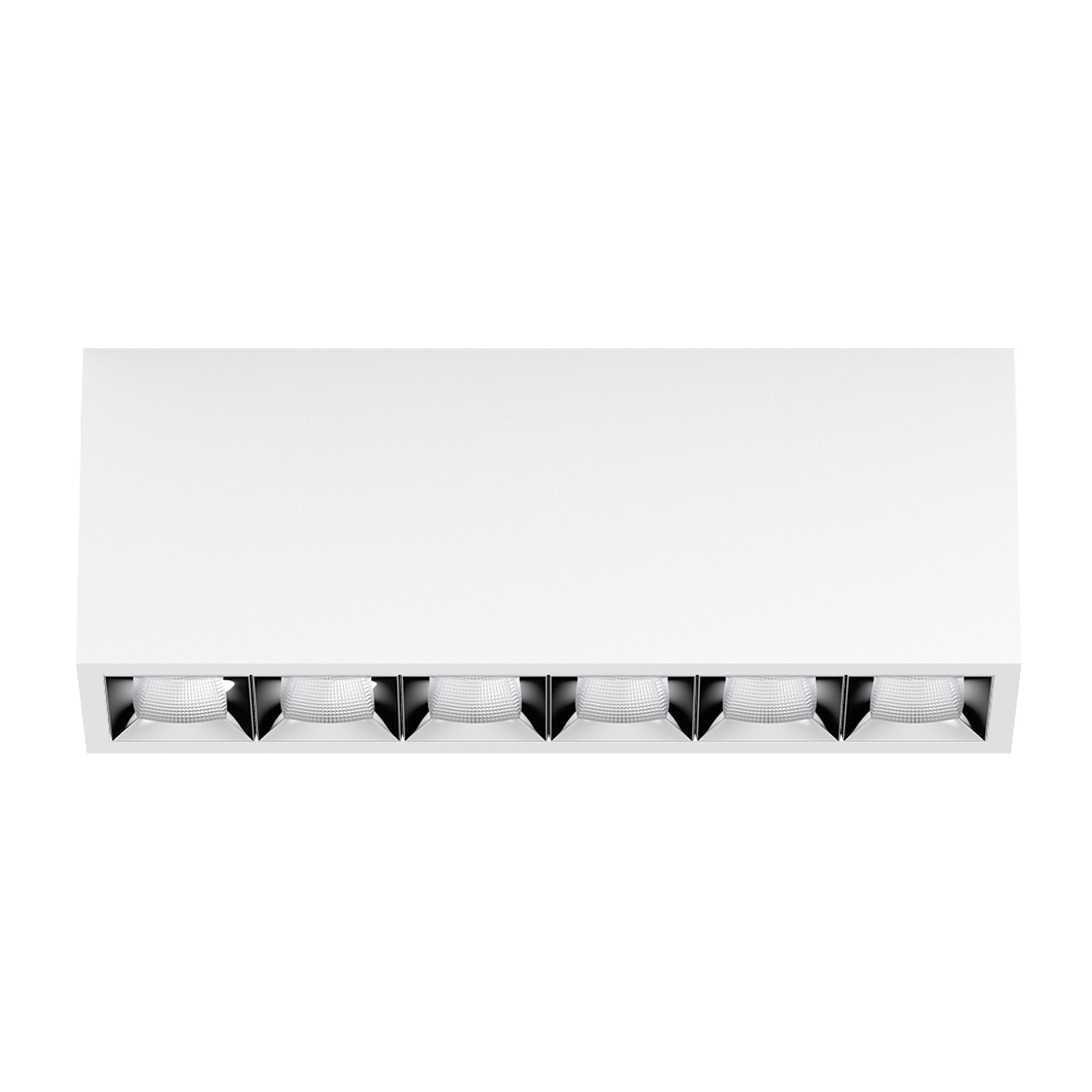 Rechteckiger Anbau-Multi-Downlight aus Aluminium; Leuchtenkörper mittels Verriegelung werkzeuglos auf Montageplatte aufsetzbar; Konverter im Leuchtenkörper integriert; Oberfläche Verkehrsweiß pulverbeschichtet; bestückt mit sechs flood square Optiken; symmetrische Lichtverteilung mit präziser Abstrahlcharakteristik, Ausstrahlwinkel 56°; hochwertiger Reflektor mit mikrofacettierter, aluminiumbedampfter Oberfläche; Reflektor Chrom; UGR ≤ 19; bildschirmtaugliche Arbeitsplatzleuchte nach DIN EN 12464-1; Leuchtdichte über 65° ≤ 3000 cd/m²; passive Kühlung der LEDs durch optimierte Kühlkörpergeometrie; Lichtfarbe 2700 K; ≤ 3 SDCM (initial MacAdam); CRI ≥ 90; min. 90% des Lichtstromes nach 50000 h Lebensdauer; energieeffiziente High-Power-LEDs mit sehr guter Farbwiedergabe; Schutzart IP20; SK1; 220-240 V; inkl. DALI-2 Konverter; nicht austauschbare Lichtquelle; Betriebsgerät durch autorisierte Fachleute austauschbar; klirrfrei;