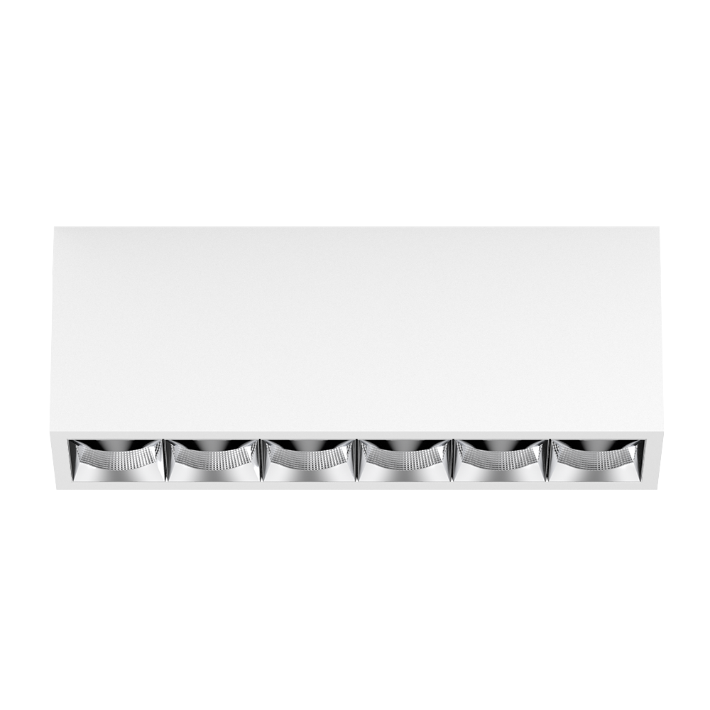 Rechteckiger Anbau-Multi-Downlight aus Aluminium; Leuchtenkörper mittels Verriegelung werkzeuglos auf Montageplatte aufsetzbar; Konverter im Leuchtenkörper integriert; Oberfläche Verkehrsweiß pulverbeschichtet; bestückt mit sechs corridor Optiken (rectangular medium); symmetrische Lichtverteilung mit präziser Abstrahlcharakteristik, Ausstrahlwinkel 34°x69°; hochwertiger Reflektor mit mikrofacettierter, aluminiumbedampfter Oberfläche; Reflektor Chrom; passive Kühlung der LEDs durch optimierte Kühlkörpergeometrie; Lichtfarbe 2700 K; ≤ 3 SDCM (initial MacAdam); CRI ≥ 90; min. 90% des Lichtstromes nach 50000 h Lebensdauer; energieeffiziente High-Power-LEDs mit sehr guter Farbwiedergabe; Schutzart IP20; SK1; 220-240 V; inkl. Konverter, nicht dimmbar; nicht austauschbare Lichtquelle; Betriebsgerät durch autorisierte Fachleute austauschbar; klirrfrei;