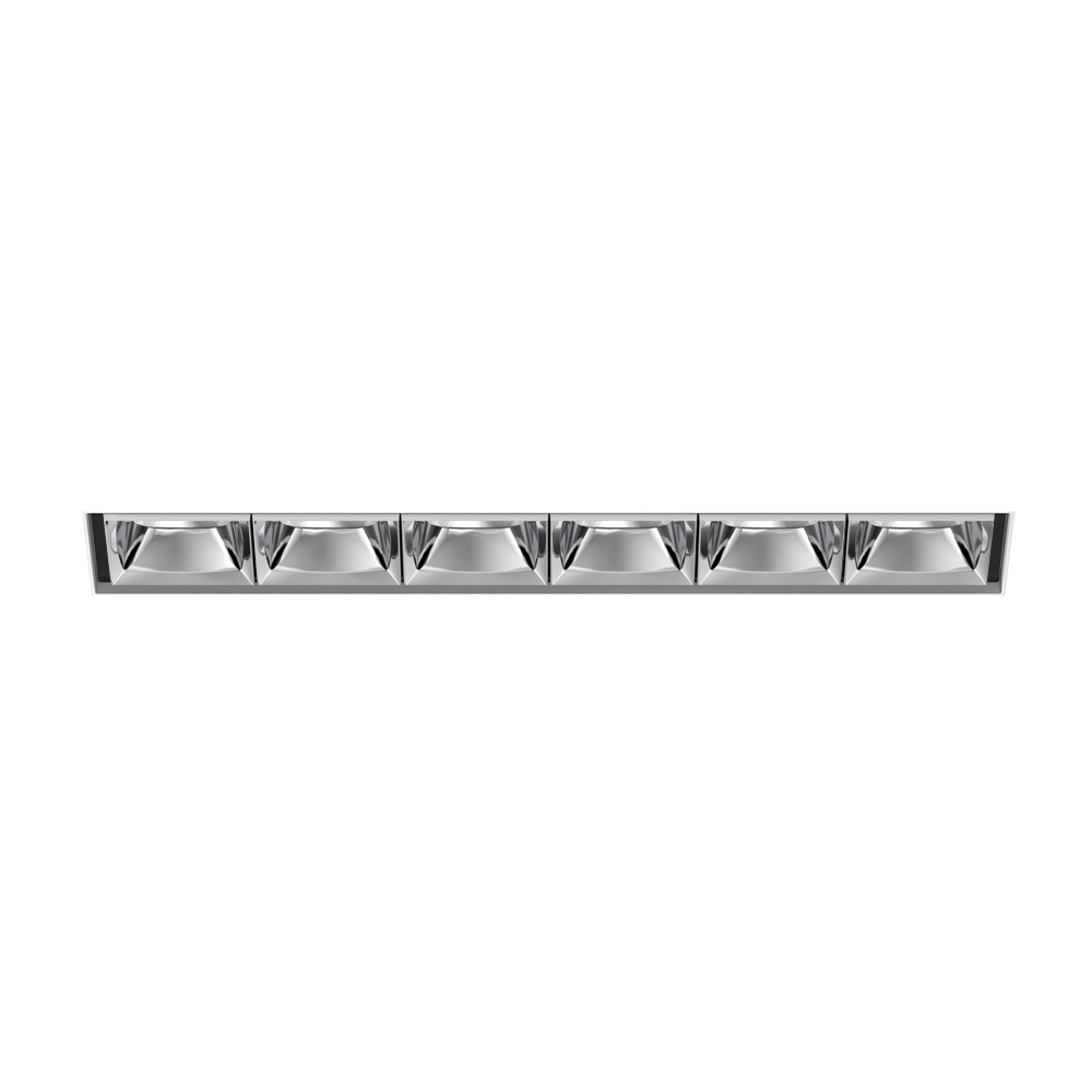 Rechteckiger Einbau-Multi-Downlight aus Aluminiumdruckguss; werkzeuglose Montage im Montageset durch patentiertes Kugelschnappsystem; rechteckiges Einbaugehäuse; für randlosen Einbau in Gipskartondecken; geeignet für Deckenstärken von 12,5/15/20/25 mm; bestückt mit sechs spot round Optiken; symmetrische Lichtverteilung mit präziser Abstrahlcharakteristik, Ausstrahlwinkel 15°; hochwertiger Reflektor mit mikrofacettierter, aluminiumbedampfter Oberfläche; Reflektor chrom; UGR ≤ 10; bildschirmtaugliche Arbeitsplatzleuchte nach DIN EN 12464-1; Leuchtdichte über 65° ≤ 1500 cd/m²; passive Kühlung der LEDs durch optimierte Kühlkörpergeometrie; Lichtfarbe 4000 K; ≤ 3 SDCM (initial MacAdam); CRI ≥ 90; min. 90% des Lichtstromes nach 50000 h Lebensdauer; energieeffiziente High-Power-LEDs mit sehr guter Farbwiedergabe; Schutzart IP20; SK2; 220-240 V; inkl. DALI-2 Konverter; Anschlussdose für Weiterverdrahtung, 3-polig oder 5-polig, als Zubehör erhältlich; Zubehör wird separat angeführt; nicht austauschbare Lichtquelle; Betriebsgerät durch autorisierte Fachleute austauschbar; klirrfrei;