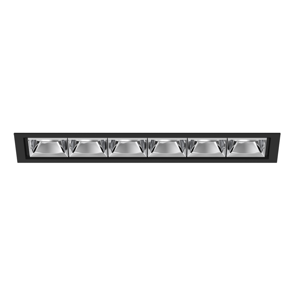 Rechteckiger Einbau-Multi-Downlight aus Aluminiumdruckguss; werkzeuglose Montage im Montageset durch patentiertes Kugelschnappsystem; rechteckiges Einbaugehäuse; mit umlaufendem Rand Tiefschwarz; geeignet für Deckenstärken von 2-25 mm; bestückt mit sechs spot round Optiken; symmetrische Lichtverteilung mit präziser Abstrahlcharakteristik, Ausstrahlwinkel 15°; hochwertiger Reflektor mit mikrofacettierter, aluminiumbedampfter Oberfläche; Reflektor chrom; UGR ≤ 10; bildschirmtaugliche Arbeitsplatzleuchte nach DIN EN 12464-1; Leuchtdichte über 65° ≤ 1500 cd/m²; passive Kühlung der LEDs durch optimierte Kühlkörpergeometrie; Lichtfarbe 4000 K; Binning initial MacAdam ≤ 3 SDCM; CRI ≥ 90; min. 90% des Lichtstromes nach 50000 h Lebensdauer; energieeffiziente High-Power-LEDs mit sehr guter Farbwiedergabe; Schutzart IP20; SK2; 220-240 V; inkl. Konverter, nicht dimmbar; Anschlussdose für Weiterverdrahtung, 3-polig oder 5-polig, als Zubehör erhältlich; Zubehör wird separat angeführt; nicht austauschbare Lichtquelle; Betriebsgerät durch autorisierte Fachleute austauschbar; klirrfrei;
