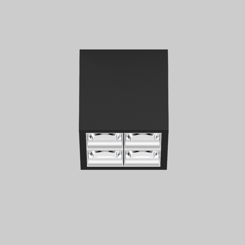 Quadratischer Anbau-Multi-Downlight aus Aluminium; Leuchtenkörper mittels Verriegelung werkzeuglos auf Montageplatte aufsetzbar; Konverter im Leuchtenkörper integriert; Oberfläche Tiefschwarz pulverbeschichtet; bestückt mit vier wallwasher Optiken; asymmetrische Lichtverteilung mit präziser Abstrahlcharakteristik; hochwertiger Reflektor mit mikrofacettierter, aluminiumbedampfter Oberfläche; Reflektor Chrom; passive Kühlung der LEDs durch optimierte Kühlkörpergeometrie; Lichtfarbe 3000 K; Binning initial MacAdam ≤ 3 SDCM; CRI ≥ 90; min. 90% des Lichtstromes nach 50000 h Lebensdauer; energieeffiziente High-Power-LEDs mit sehr guter Farbwiedergabe; Schutzart IP20; SK1; 220-240 V; inkl. DALI-2 Konverter; nicht austauschbare Lichtquelle; Betriebsgerät durch autorisierte Fachleute austauschbar; klirrfrei;