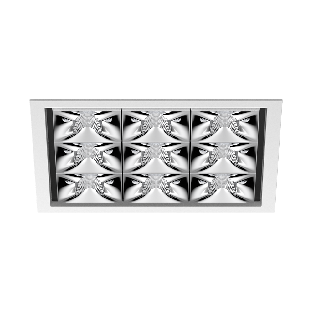 Quadratischer Einbau-Multi-Downlight aus Aluminiumdruckguss; werkzeuglose Montage im Montageset durch patentiertes Kugelschnappsystem; quadratisches Einbaugehäuse; mit umlaufendem Rand Verkehrsweiß; geeignet für Deckenstärken von 2-25 mm; bestückt mit neun medium round Optiken; symmetrische Lichtverteilung mit präziser Abstrahlcharakteristik, Ausstrahlwinkel 33°; hochwertiger Reflektor mit mikrofacettierter, aluminiumbedampfter Oberfläche; Reflektor chrom; UGR ≤ 10; bildschirmtaugliche Arbeitsplatzleuchte nach DIN EN 12464-1; Leuchtdichte über 65° ≤ 3000 cd/m²; passive Kühlung der LEDs durch optimierte Kühlkörpergeometrie; Lichtfarbe 4000 K; Binning initial MacAdam ≤ 3 SDCM; CRI ≥ 90; min. 90% des Lichtstromes nach 50000 h Lebensdauer; energieeffiziente High-Power-LEDs mit sehr guter Farbwiedergabe; Schutzart IP20; SK2; 220-240 V; inkl. Konverter, nicht dimmbar; Anschlussdose für Weiterverdrahtung, 3-polig oder 5-polig, als Zubehör erhältlich; Zubehör wird separat angeführt; nicht austauschbare Lichtquelle; Betriebsgerät durch autorisierte Fachleute austauschbar; klirrfrei;