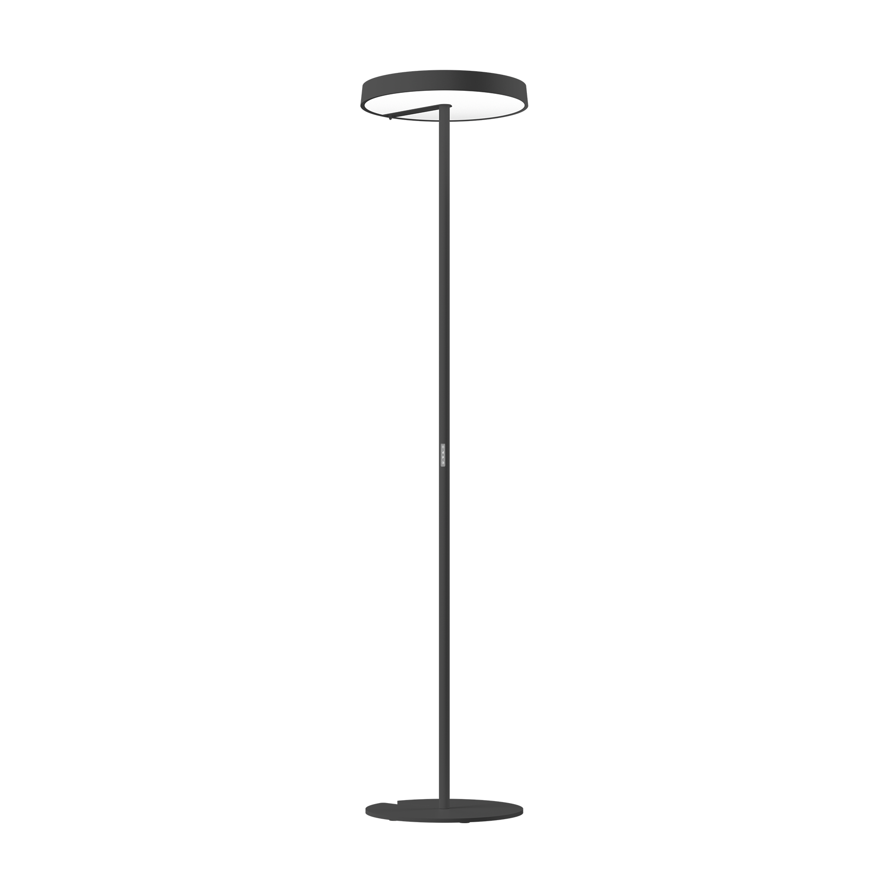 Stehleuchte mit konischem Leuchtenkopf aus Aluminiumdruckguss; runder Standfuß mit Ausnehmung für Tischfuß; rundes Aluminiumstandrohr zentral angeordnet; Oberfläche Schwarzgrau pulverbeschichtet; direkt/indirekte Abstrahlcharakteristik; Indirektlichtanteil mit eigenen Platinen für erhöhten Lichtstrom und maximale Deckenaufhellung; Indirektlichtanteil mit klarem Acrylglas abgedeckt; Direktanteil: mikroprismatische PMMA Abdeckung; absolut homogene Ausleuchtung durch Einsatz einer diffusen Folie auf Polycarbonatbasis; verbessertes Verhältnis von Streuwirkung zu Lichtdurchlässigkeit; UGR ≤ 19; Lichtfarbe 3000 K; ≤ 3 SDCM (initial MacAdam); CRI ≥ 80; min. 90% des Lichtstromes nach 50000 Betriebsstunden; energieeffiziente LEDs mit hoher Farbwiedergabe; Schutzart IP20; SK1; 220-240 V; Leuchte mit integriertem Infrarot Anwesenheits- und Helligkeitssensor (ESSENTIAL sensor); automatische Regelung der Leuchte auf individuell einstellbaren Helligkeitswert; mit variabler Abschaltautomatik; inkl. TOUCH DIM Steuerung zur individuell Regelung der Helligkeit; Anwesenheitssensor-Erfassungsbereich ø4,5m am Fußboden; inkl. Anschlussleitung (3m) mit Schutzkontaktstecker; schallabsorbierendes Zubehör erhältlich: Akustikelemente aus hochwertigem, selbsttragenden, mind. 50 % recycelten PET-Filz (hohe akustische Performance durch Materialaufdopplung) oder als akustisch wirksamer Leuchtenschirm (große Farbauswahl) mit schallabsorbierenden Eigenschaften; Lichtquelle durch autorisierte Fachleute austauschbar; Betriebsgerät durch autorisierte Fachleute austauschbar;
