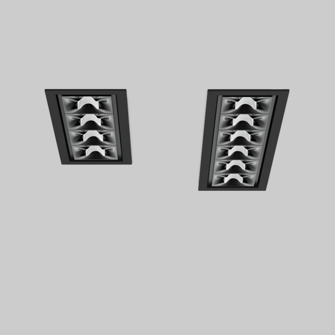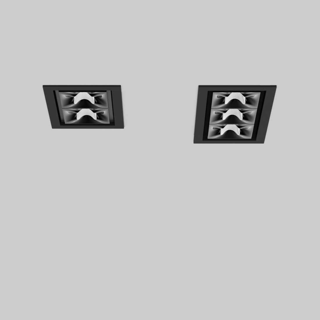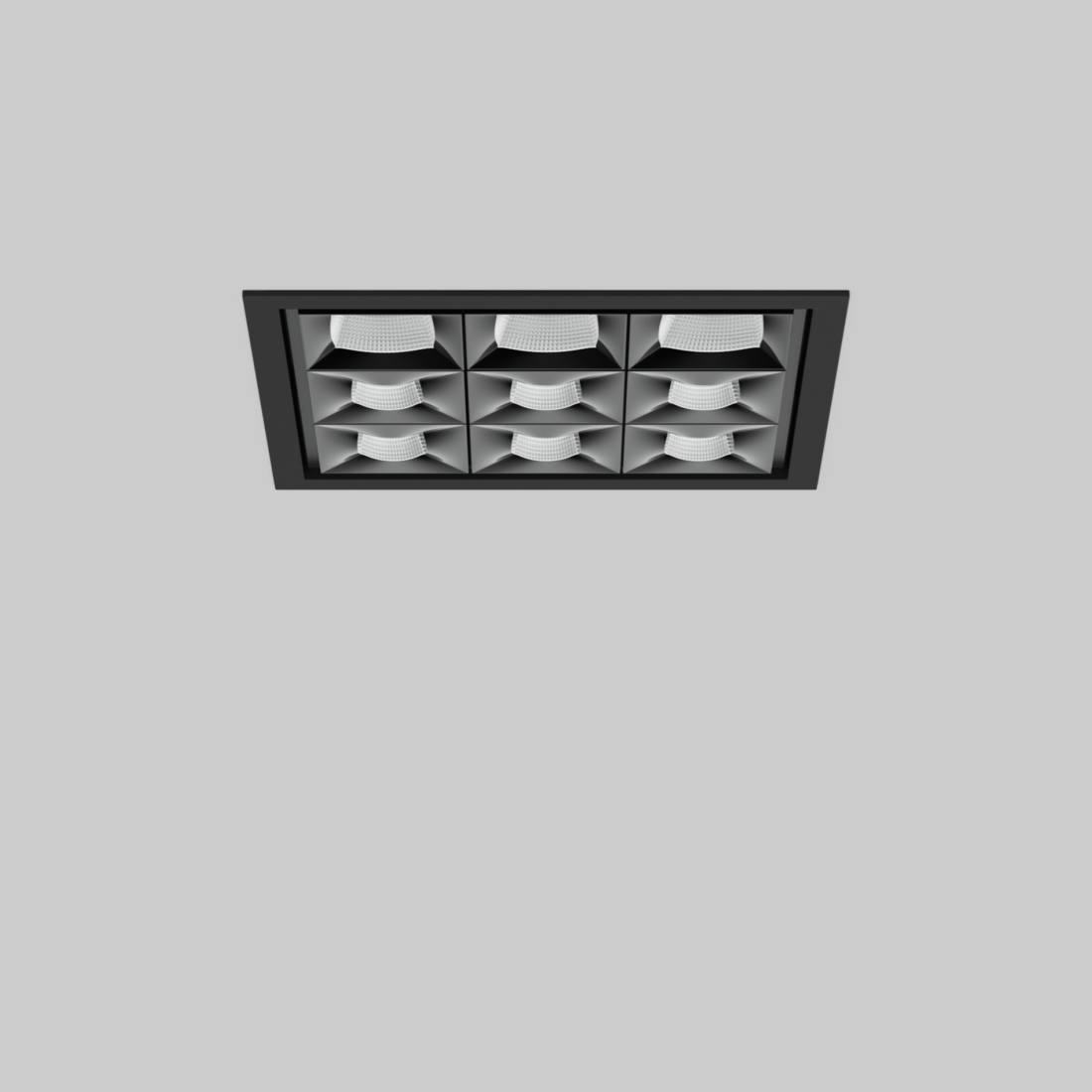 Square or rectangular recessed multi-downlight made of die-cast aluminium; equipped with one (Q1) / two (L2) / three (L3) / four (L4/Q4) / six (L6) / nine (Q9) individually selectable, customised light elements; installation without tools in mounting set with ball catch system; easy electrical installation by means of reverse polarity protected plug-in connections; suitable for ceiling thickness of 0.1-1"; surface powder coated; installation possible in different housings; high quality reflector with micro-faceted, aluminum-vaporised surface; precise radiation characteristic with different symmetrical light distributions; or with asymmetric light distribution; energy-efficient high power LEDs with very good colour rendering