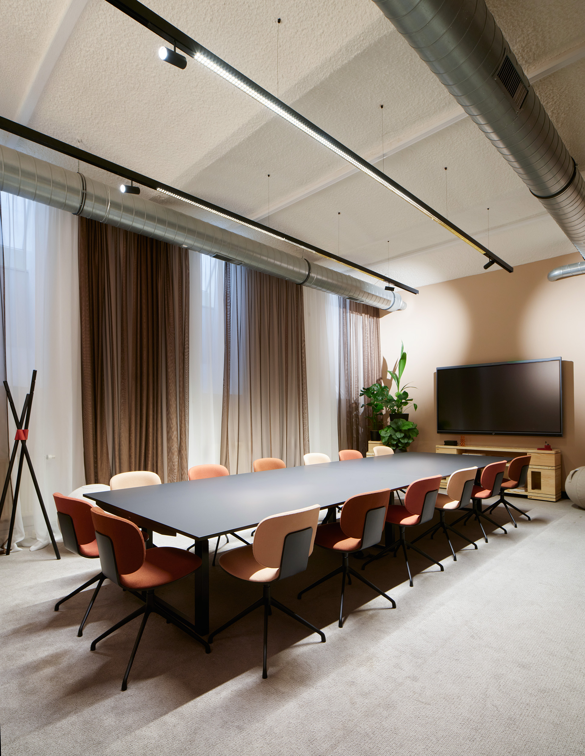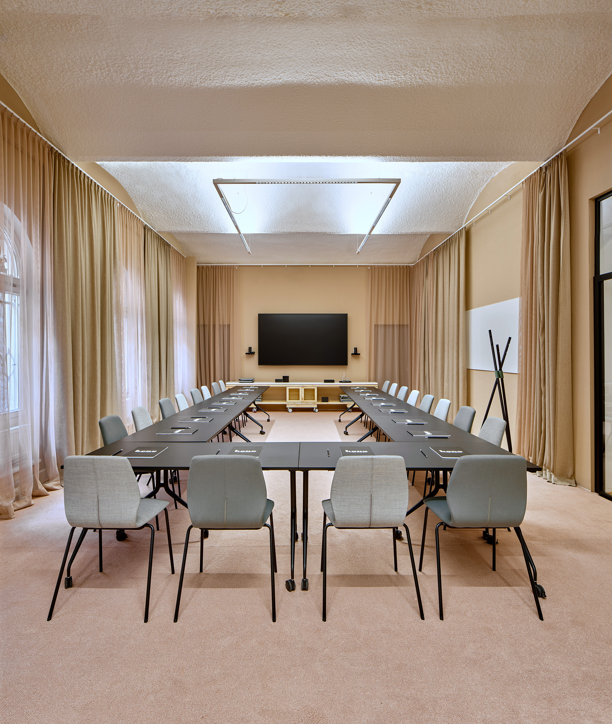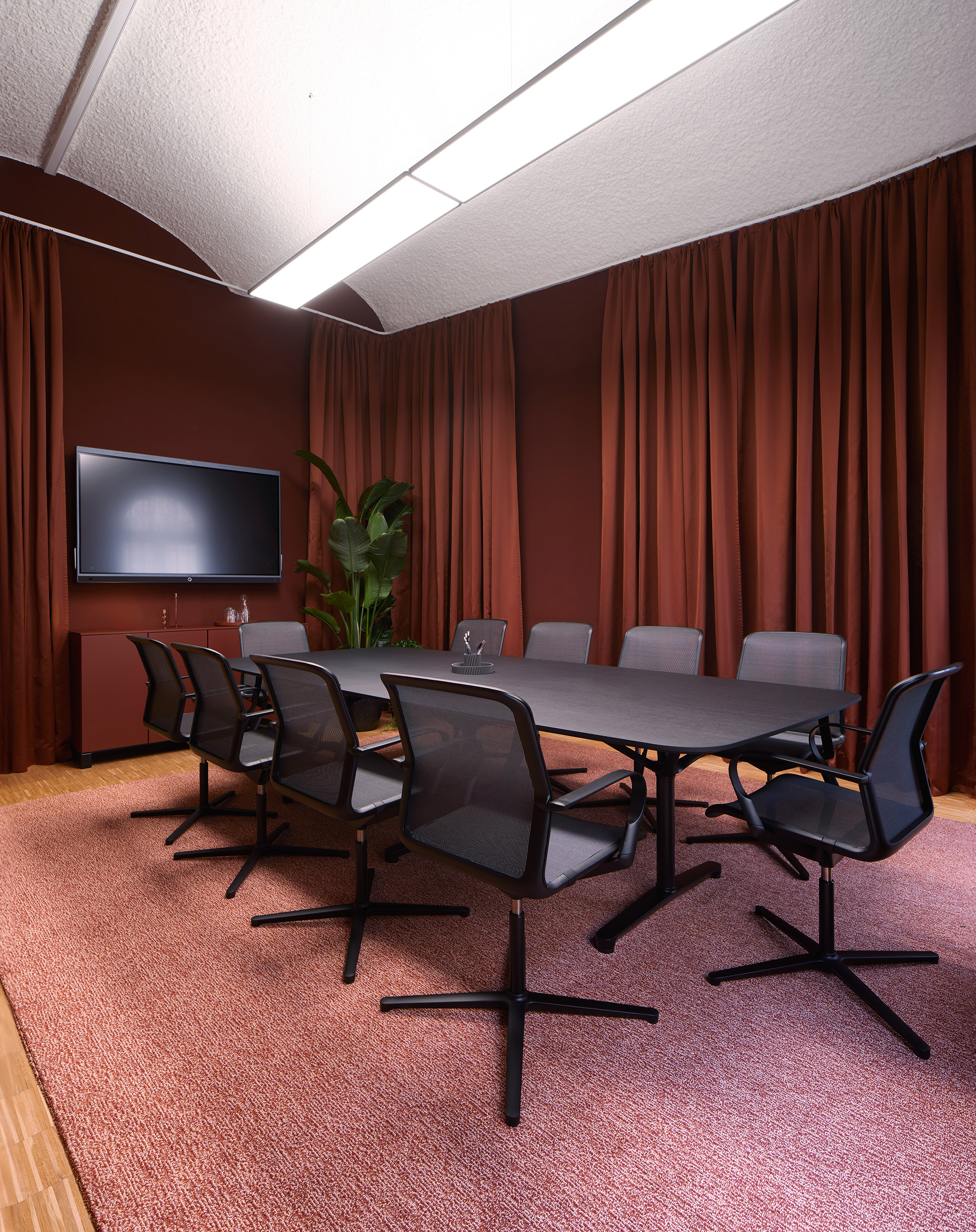 The classic meeting room has been deliberately reinterpreted: each suite is individually designed, architecturally curated and features a distinctive aesthetic and lighting atmosphere. Different design languages – from clean lines to soft curves – meet harmonising colour palettes and high-quality materials. Bespoke lamps highlight the unique character of each space and create atmospheric rooms that promote concentration and support communication. The biggest challenge was to integrate this complex idea into a cohesive overall concept.