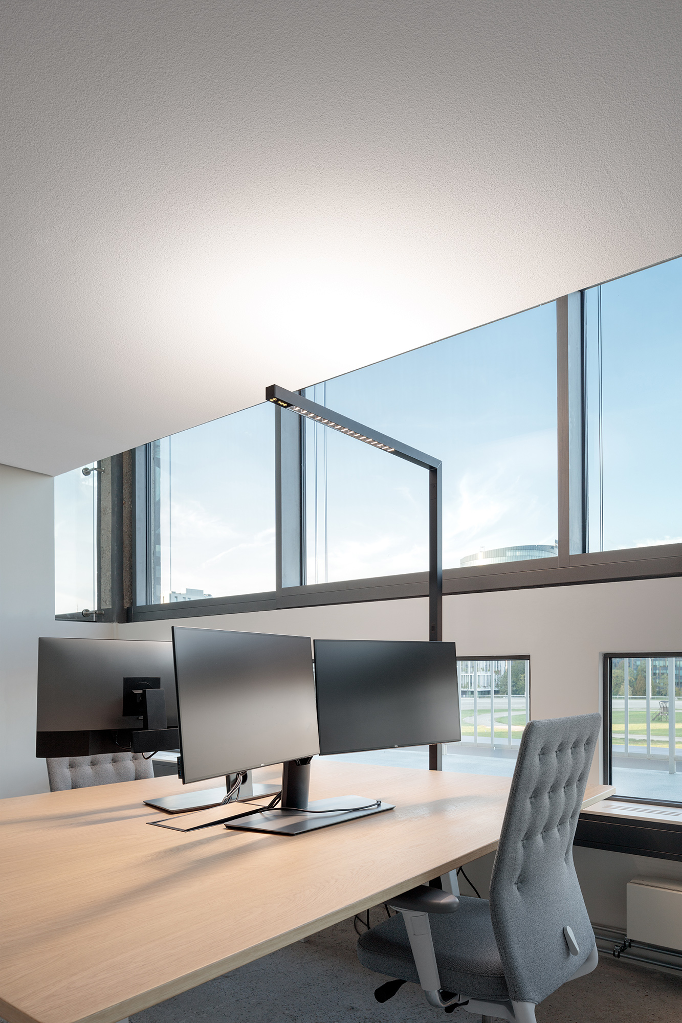 A versatile free standing luminaire, flat and elegant: this is TASK. With a slim profile of only 15 mm, it fits everywhere, and the innovative LGP body technology provides direct and indirect light. With energy-efficient LEDs and perfect colour rendering. The switch is built into the standpipe for a discreet look. Loxone Air module for smart office integration included.