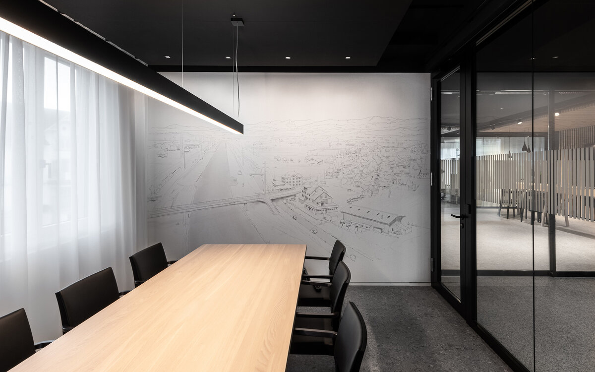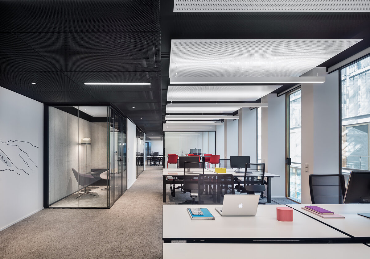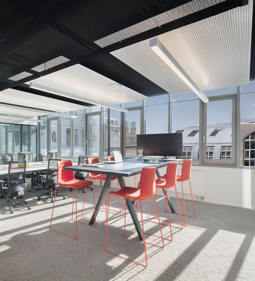 Luminaire housing from extruded aluminium profile, angular design; no visible screws; surface powder coated; pendant fitting with cable suspension; with integrated toolless suspension height adjustment; spring clip attachment to the luminaire; freely positionable; incl. transparent feed; light inset made from extruded profile for improved thermal management; micro prismatic PMMA diffuser incl. diffuser film for homogeneous illumination and reduced luminance; direct / indirect light distribution; indirect light component with integrated PC boards for maximum, homogeneous ceiling illumination; energy-efficient LEDs with very good colour rendering
