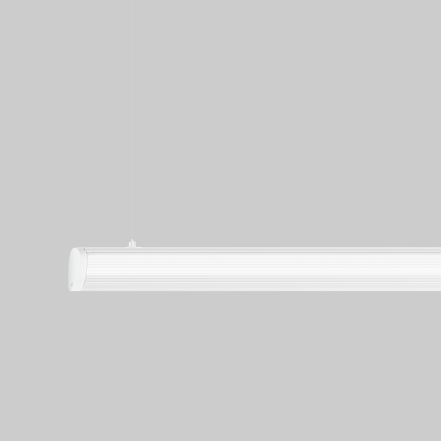 Supporting profile in extruded aluminium; end cap in aluminium; surface powder coated; suspended luminaire with cable suspension; height adjustment without tools; incl. feeder cable; light control via high quality lens system for maximum, homogeneous illumination; clear, cylindrical cover with linear prismatic optic; energy-efficient LEDs with very good colour rendering