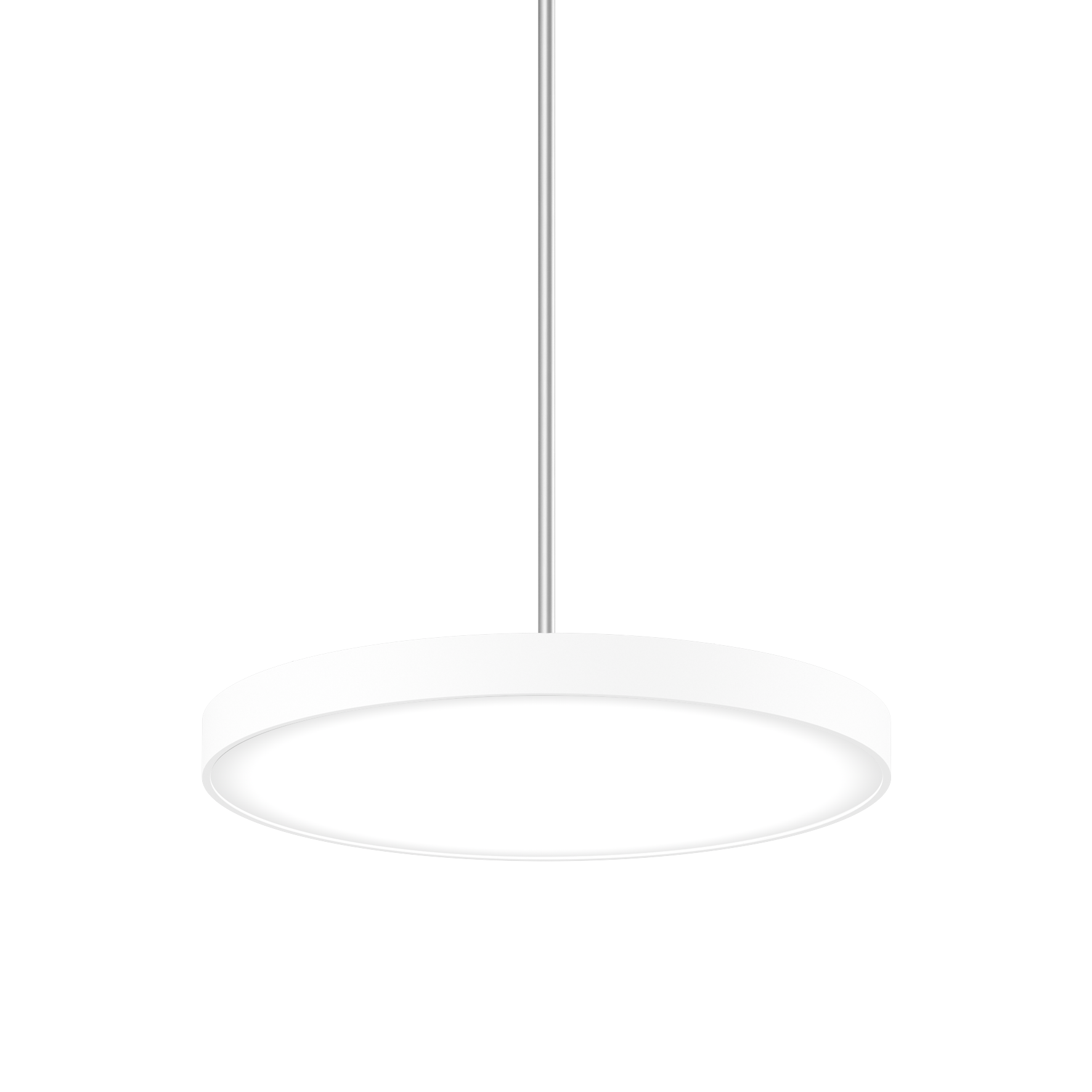 Round luminaire housing in aluminium, rolled profile, seamlessly welded; surface pure white powder coated; highly reflective coating for improved efficiency; suspended luminaire with adjustable pendant rod mounting (chrome) 1000mm, feed in rod; microprismatic PMMA cover; completely homogeneous illumination; UGR ≤ 19; VDU compatible workplace luminaire according to DIN EN 12464-1; luminance above 65° ≤ 3000 cd/m²; light colour 4000 K; binning initial MacAdam ≤ 3 SDCM; CRI ≥ 80; min. 90% of luminous flux after 50000 operating hours; energy efficient LEDs with high CRI; canopy with 2 cable openings and plug-in terminal for through wiring; degree of protection IP40; PC1; 220-240 V; internal wiring in light halogen free; incl. converter, non dimmable; light source replaceable by an authorized professional; control gear replaceable by an authorized professional;