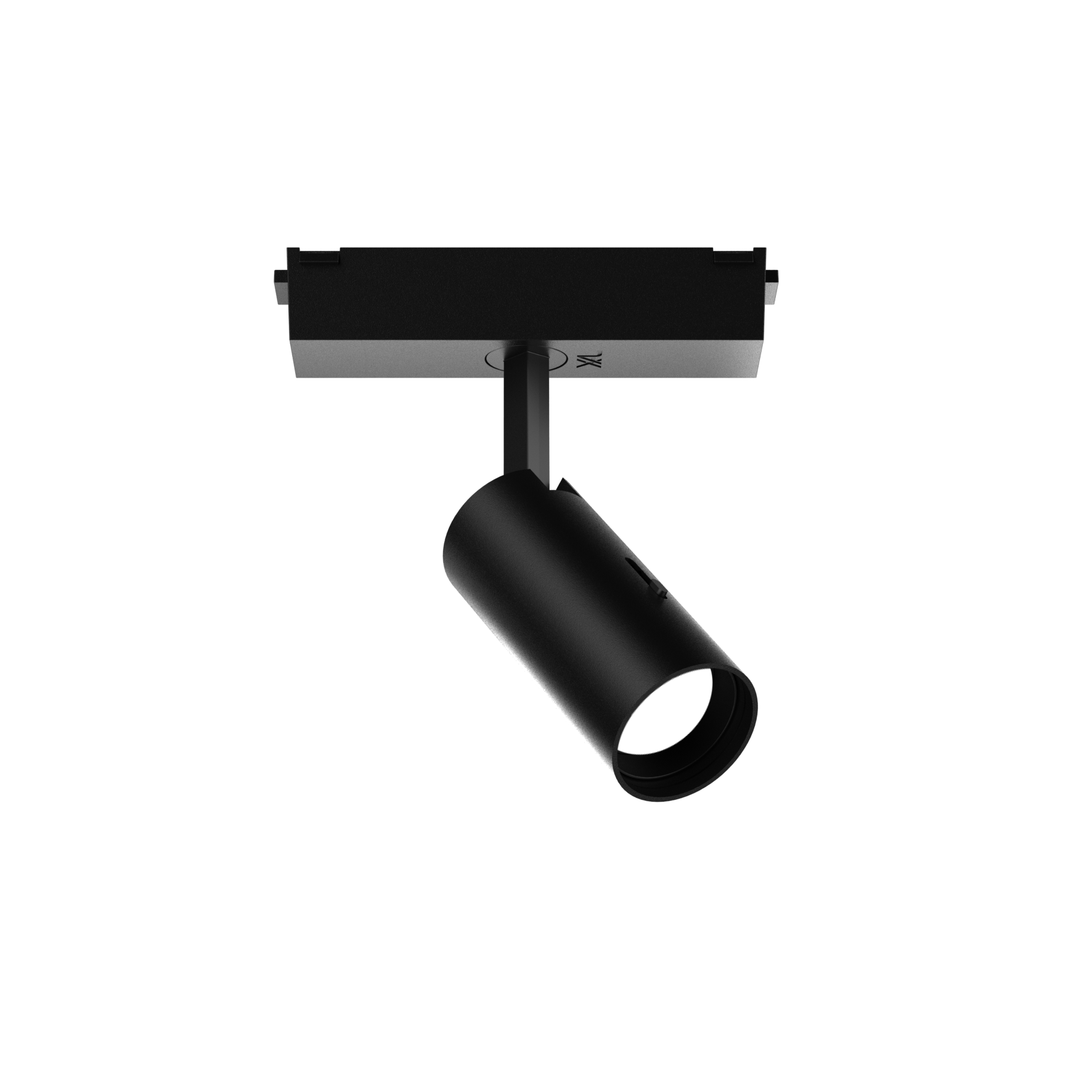 Cylindrical spotlight in aluminium; surface jet black powder coated; 360° rotatable and 90° tiltable; spotlight can be installed and moved without tools by means of magnetic holders+locking; power supplied via MOVE IT system track profile; hot plug protection; passive cooling of the LEDs through improved heat sink geometry; with COB (Chip on Board) technology for maximum efficiency; no appearance of multiple shadows; light colour 3000 K; ≤ 2 SDCM (initial MacAdam); CRI ≥ 90; min. 80% of luminous flux after 50000 operating hours; energy efficient LEDs with high CRI; good glare control through recessed light point level; incl. high quality plano-convex glass lens; precise object focusing through adjustable lens; adjustable beam angle of 17° - 43°; focusing by means of patented slider on the spotlight head; degree of protection IP20; PC3; 48 V; DALI single control; flicker-free visual comfort through analogue current control (minimum value 1%); optical attachment available as accessory; accessories are listed separately; light source not replaceable;