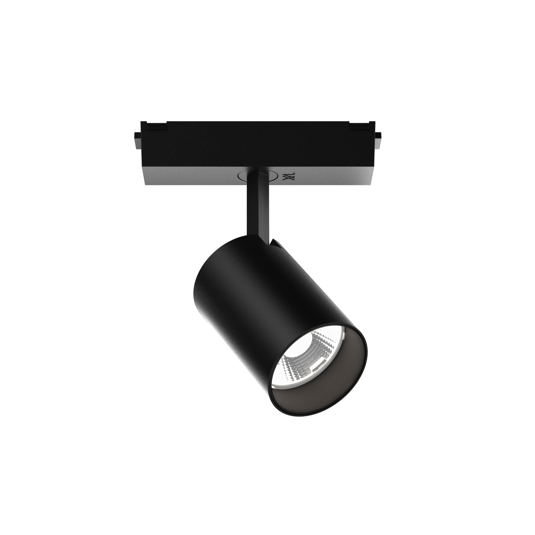 Cylindrical spotlight in aluminium; surface jet black powder coated; 360° rotatable and 90° tiltable; spotlight can be installed and moved without tools by means of magnetic holders+locking; power supplied via MOVE IT system track profile; hot plug protection; passive cooling of the LEDs through improved heat sink geometry; with high power LED for maximum efficiency; no appearance of multiple shadows; light colour 3000 K; ≤ 3 SDCM (initial MacAdam); CRI ≥ 90; min. 85% of luminous flux after 50000 operating hours; energy efficient LEDs with high CRI; good glare control through recessed light point level; incl. high quality lens system; precise radiation characteristic with 8° beam; degree of protection IP20; PC3; 48 V; DALI single control; flicker-free visual comfort through analogue current control (minimum value 1%); optical attachment available as accessory; accessories are listed separately; light source not replaceable;