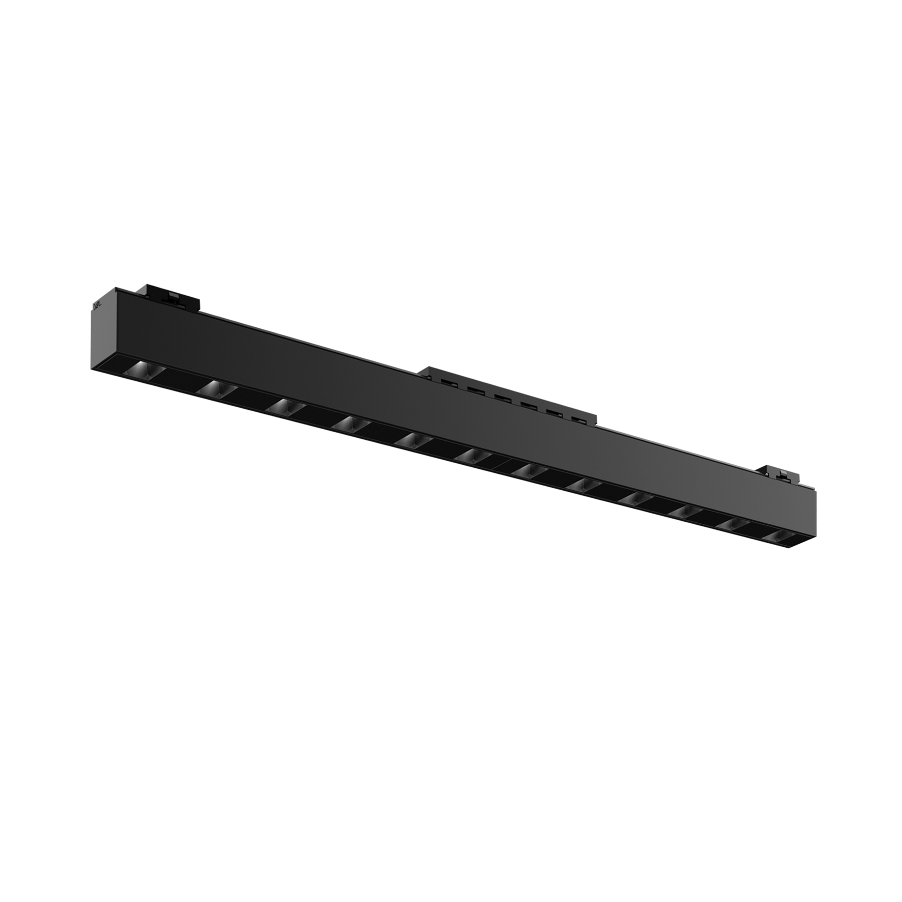 Linear light inset made of aluminium; surface anodised jet black; light inset can be installed and moved without tools by means of magnetic holders+locking; flush with profile system; power supplied via MOVE IT system track profile; hot plug protection; fitted with single LED light points; passive cooling of the LEDs through improved heat sink geometry; with CSP (Chip-Scale-Packaging) technology for maximum efficiency; light colour 3000 K; binning initial MacAdam ≤ 3 SDCM; CRI ≥ 97; min. 80% of luminous flux after 50000 operating hours; energy efficient LEDs with high CRI; good glare control through recessed light point level; inserted lenses with medium radiation characteristic 31°; UGR ≤ 16; degree of protection IP20; PC3; 48 V; DALI single control; flicker-free visual comfort through analogue current control (minimum value 1%); light source not replaceable;