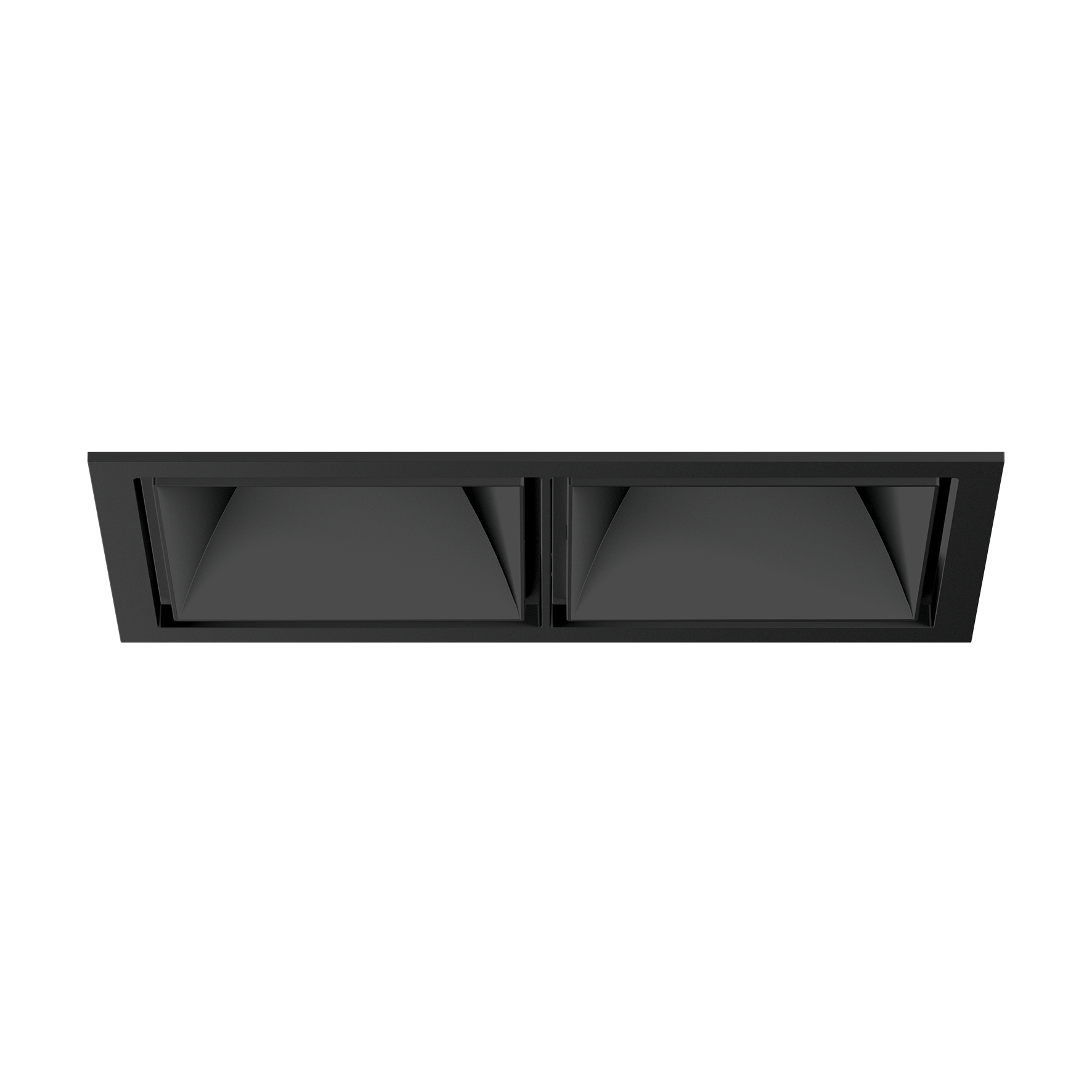 Recessed square spotlight in die-cast aluminium; 2 lamps; surface jet black; installation without tools in mounting set due to patented ball catch system; rectangular installation housing; with trim jet black; suitable for ceiling thickness of 2-25 mm; passive cooling of the LEDs through improved heat sink geometry; with COB (Chip on Board) technology for maximum efficiency; no appearance of multiple shadows; light colour 4000 K; ≤ 2 SDCM (initial MacAdam); CRI ≥ 90; min. 80% of luminous flux after 50000 operating hours; energy efficient LEDs with high CRI; incl. high quality lens system; precise radiation characteristic with 20° beam; UGR ≤ 13; degree of protection from below IP44 (from above IP20); PC2; 220-240 V; incl. converter, non dimmable; through wiring connection box, 3-pole or 5-pole, available as an accessory; accessories are listed separately; light source replaceable by an authorized professional; control gear replaceable by an authorized professional;
