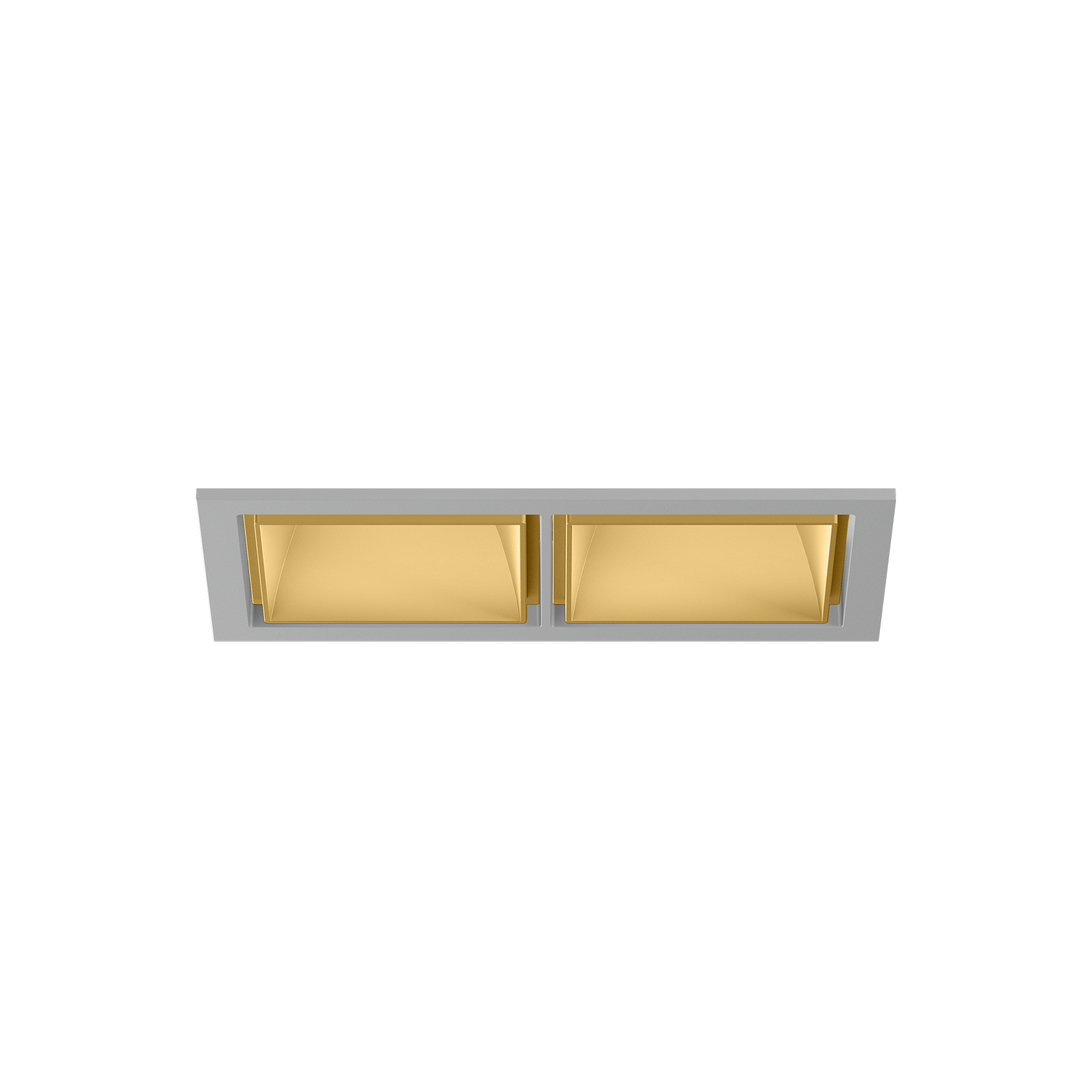 Recessed square spotlight in die-cast aluminium; 2 lamps; surface gold; installation without tools in mounting set due to patented ball catch system; rectangular installation housing; with trim silver-grey; suitable for ceiling thickness of 2-25 mm; passive cooling of the LEDs through improved heat sink geometry; with COB (Chip on Board) technology for maximum efficiency; no appearance of multiple shadows; light colour 3000 K; binning initial MacAdam ≤ 2 SDCM; CRI ≥ 90; energy efficient LEDs with high CRI; incl. high quality lens system; precise radiation characteristic with 12° beam; UGR ≤ 16; VDU compatible workplace luminaire according to DIN EN 12464-1; luminance above 65° ≤ 3000 cd/m²; degree of protection from below IP44 (from above IP20); PC2 220-240V; incl. DALI-2 converter; through wiring connection box, 3-pole or 5-pole, available as an accessory; accessories are listed separately; light source replaceable by an authorized professional; control gear replaceable by an authorized professional;