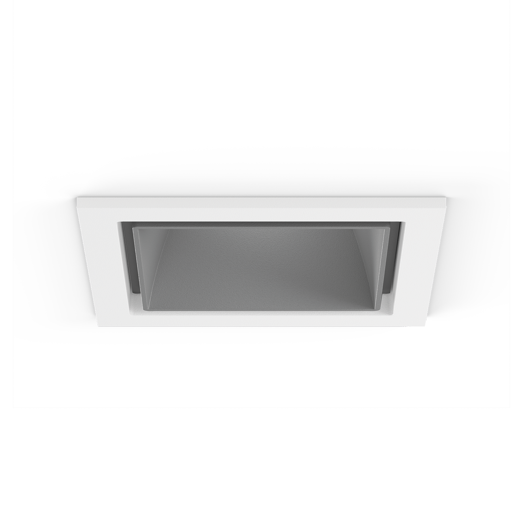 Recessed square spotlight in die-cast aluminium; 1 lamp; surface matt silver; installation without tools in mounting set due to patented ball catch system; square installation housing; with trim traffic white; suitable for ceiling thickness of 2-25 mm; passive cooling of the LEDs through improved heat sink geometry; with COB (Chip on Board) technology for maximum efficiency; no appearance of multiple shadows; light colour 2700 K; binning initial MacAdam ≤ 2 SDCM; CRI ≥ 90; energy efficient LEDs with high CRI; incl. high quality lens system; precise radiation characteristic with 12° beam; UGR ≤ 16; VDU compatible workplace luminaire according to DIN EN 12464-1; luminance above 65° ≤ 1500 cd/m²; degree of protection from below IP44 (from above IP20); PC2; 220-240 V; incl. DALI-2 converter; through wiring connection box, 3-pole or 5-pole, available as an accessory; accessories are listed separately; light source replaceable by an authorized professional; control gear replaceable by an authorized professional;