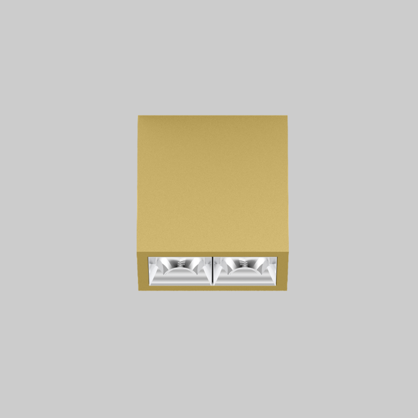 Rectangular surface mounted multi-downlight made of aluminium; luminaire housing can be attached to mounting plate without tools by interlock; converter integrated into luminaire housing; surface gold dust powder coated; equipped with two wallwasher floor light elements; asymmetrical light distribution with precise radiation characteristic; high quality reflector with micro-faceted, aluminum-vaporised surface; Reflector chrome; passive cooling of the LEDs through improved heat sink geometry; light colour 3000 K; binning initial MacAdam ≤ 3 SDCM; CRI ≥ 90; min. 90% of luminous flux after 50000 operating hours; energy-efficient high power LEDs with very good colour rendering; degree of protection IP20; PC1; 220-240 V; incl. converter, non dimmable; light source not replaceable; control gear replaceable by an authorized professional; clank-free;
