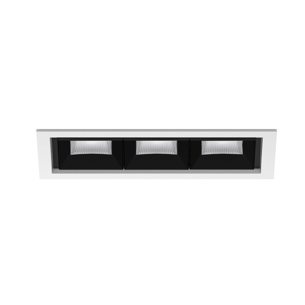Rectangular recessed multi-downlight made of die-cast aluminium; installation without tools in mounting set due to patented ball catch system; rectangular installation housing; with trim traffic white; suitable for ceiling thickness of 2-25 mm; equipped with three wide flood square light elements; symmetrical light distribution with precise radiation characteristic, beam angle 71°; high quality reflector with micro-faceted, aluminum-vaporised surface; black reflector; passive cooling of the LEDs through improved heat sink geometry; light colour 4000 K; binning initial MacAdam ≤ 3 SDCM; CRI ≥ 90; min. 90% of luminous flux after 50000 operating hours; energy-efficient high power LEDs with very good colour rendering; degree of protection IP20; PC2; 220-240 V; incl. converter, non dimmable; through wiring connection box, 3-pole or 5-pole, available as an accessory; accessories are listed separately; light source not replaceable; control gear replaceable by an authorized professional; clank-free;