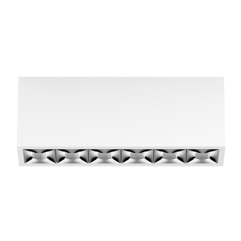 Rectangular surface mounted multi-downlight made of aluminium; luminaire housing can be attached to mounting plate without tools by interlock; converter integrated into luminaire housing; surface traffic white powder coated; equipped with six medium square light elements; symmetrical light distribution with precise radiation characteristic, beam angle 32°; high quality reflector with micro-faceted, aluminum-vaporised surface; Reflector chrome; UGR ≤ 10; passive cooling of the LEDs through improved heat sink geometry; light colour 4000 K; ≤ 3 SDCM (initial MacAdam); CRI ≥ 90; min. 90% of luminous flux after 50000 operating hours; energy-efficient high power LEDs with very good colour rendering; degree of protection IP20; PC1; 220-240 V; incl. DALI-2 converter; light source not replaceable; control gear replaceable by an authorized professional; clank-free;