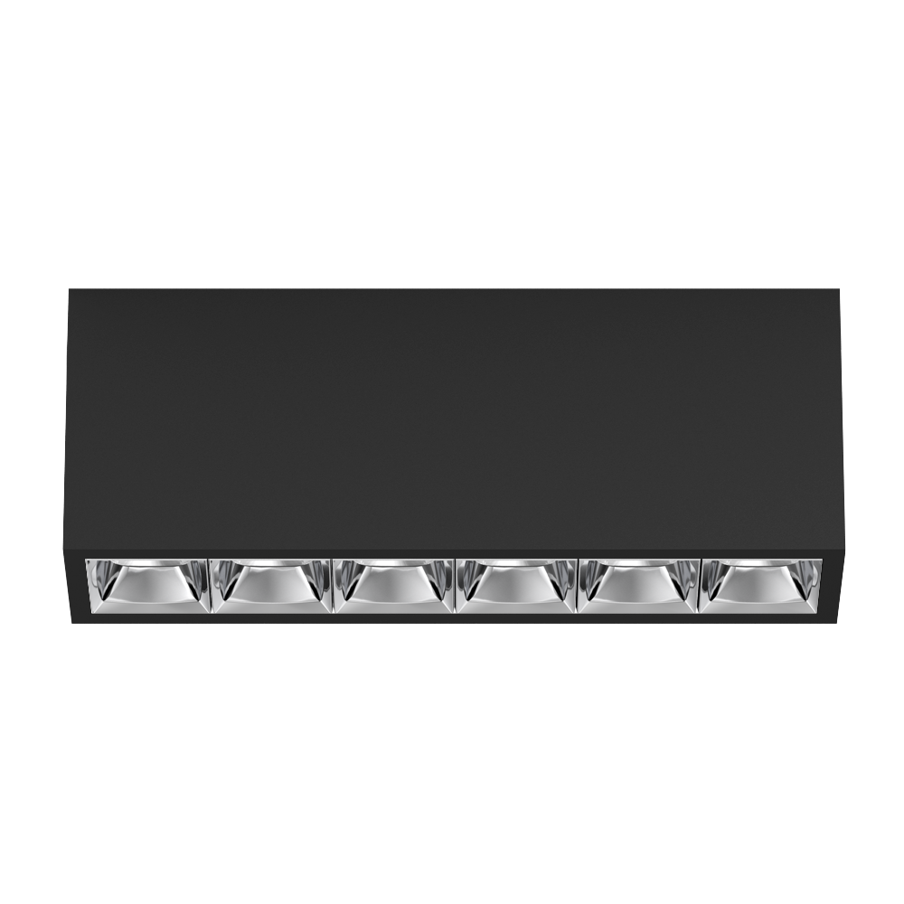 Rectangular surface mounted multi-downlight made of aluminium; luminaire housing can be attached to mounting plate without tools by interlock; converter integrated into luminaire housing; surface jet black powder coated; equipped with six spot round light elements; symmetrical light distribution with precise radiation characteristic, beam angle 15°; high quality reflector with micro-faceted, aluminum-vaporised surface; Reflector chrome; UGR ≤ 10; VDU compatible workplace luminaire according to DIN EN 12464-1; luminance above 65° ≤ 1500 cd/m²; passive cooling of the LEDs through improved heat sink geometry; light colour 3000 K; binning initial MacAdam ≤ 3 SDCM; CRI ≥ 90; min. 90% of luminous flux after 50000 operating hours; energy-efficient high power LEDs with very good colour rendering; degree of protection IP20; PC1; 220-240 V; incl. converter, non dimmable; light source not replaceable; control gear replaceable by an authorized professional; clank-free;