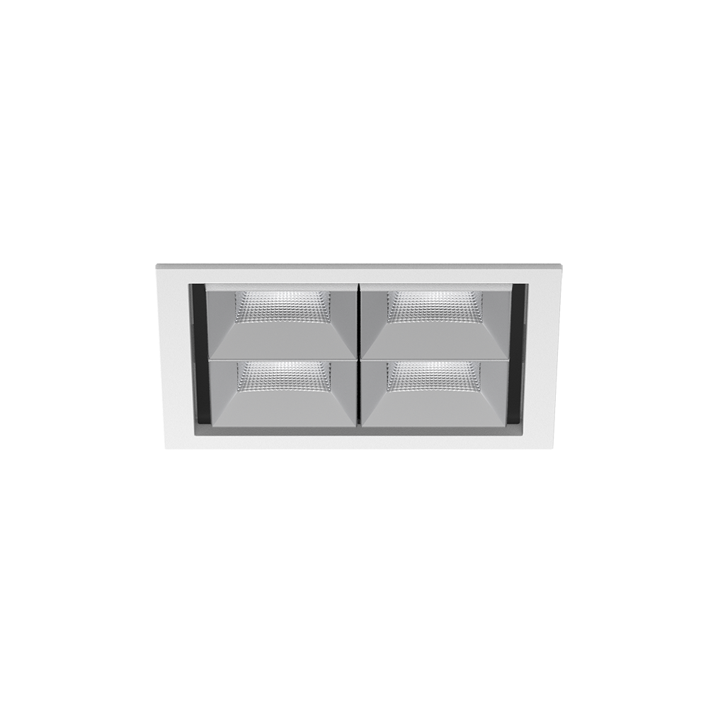 Square recessed multi-downlight made of die-cast aluminium; installation without tools in mounting set due to patented ball catch system; square installation housing; with trim traffic white; suitable for ceiling thickness of 2-25 mm; equipped with four wide flood square light elements; symmetrical light distribution with precise radiation characteristic, beam angle 71°; high quality reflector with micro-faceted, aluminum-vaporised surface; chrome reflector; passive cooling of the LEDs through improved heat sink geometry; light colour 3000 K; ≤ 3 SDCM (initial MacAdam); CRI ≥ 90; min. 90% of luminous flux after 50000 operating hours; energy-efficient high power LEDs with very good colour rendering; degree of protection IP20; PC2; incl. DALI-2 converter; through wiring connection box, 3-pole or 5-pole, available as an accessory; accessories are listed separately; light source not replaceable; control gear replaceable by an authorized professional; clank-free;