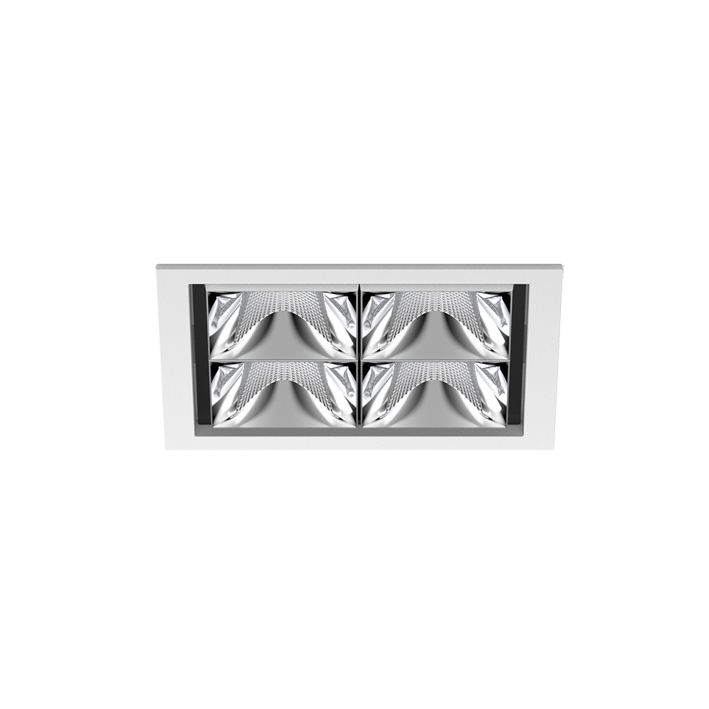 Square recessed multi-downlight made of die-cast aluminium; installation without tools in mounting set due to patented ball catch system; square installation housing; with trim traffic white; suitable for ceiling thickness of 2-25 mm; equipped with four wide flood round light elements; symmetrical light distribution with precise radiation characteristic, beam angle 72°; high quality reflector with micro-faceted, aluminum-vaporised surface; chrome reflector; passive cooling of the LEDs through improved heat sink geometry; light colour 2700 K; ≤ 3 SDCM (initial MacAdam); CRI ≥ 90; min. 90% of luminous flux after 50000 operating hours; energy-efficient high power LEDs with very good colour rendering; degree of protection IP20; PC2; incl. DALI-2 converter; through wiring connection box, 3-pole or 5-pole, available as an accessory; accessories are listed separately; light source not replaceable; control gear replaceable by an authorized professional; clank-free;