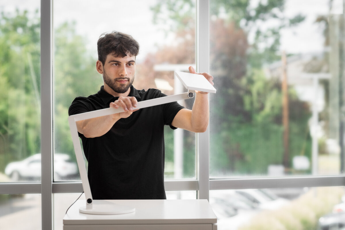 Desk lamp in puristic design with high functionality; lamp head 360° rotatable and +/- 15° tiltable; surface powder coated; direct light distribution by LGP body (Light Guiding Prism); side coupled light directed downwards by laser engraving; completely homogeneous illumination; energy-efficient LEDs with very good colour rendering; continuously adjustable dimming via optical sensor (10-100 % analog); integrated USB charging socket for charging of a smart device; version with presence detector