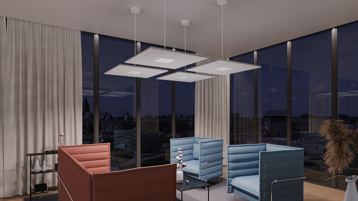 Elemento acústico de fieltro PET al menos un 50 % reciclado y autoportante de calidad superior con propiedades de absorción del sonido; forma cuadrado; superficie de alta calidad táctil y visual con motivos en relieve; absorción del sonido directo y del reflejado por el techo; con ello gran rendimiento acústico; montaje suspendido con MITA square 200 acoustic suspended (LUMINAIRE o BLIND SUSPENSION); opcionalmente con sensor (ESSENTIAL o SENSE)