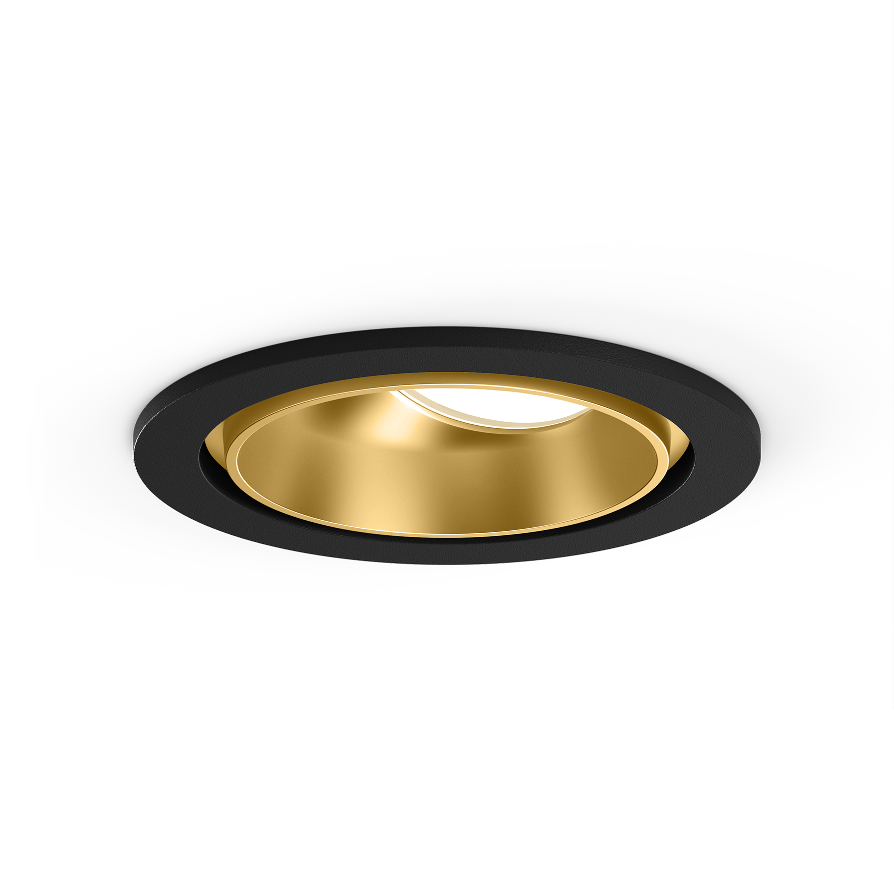 Proyector empotrable redondo de fundición inyectada de aluminio; de 1 lámpara; superficie dorado; giratorio 360° y orientable 30°; montaje sin herramientas mediante kit de montaje con sistema de inserción por bola patentado; carcasa de montaje redondo; con marco negro intenso; apropiada para grosores de techo de 2-25 mm; refrigeración pasiva de los LEDs por medio de una geometría de cuerpo de refrigeración optimizada; con tecnología COB (Chip on Board) para eficiencia máxima; ninguna formación de sombras múltiples; color de luz 2700 K; binning inicialmente MacAdam ≤ 2 SDCM; CRI ≥ 90; mín. 80 % del flujo luminoso después de 50000 horas de funcionamiento; LED energéticamente eficientes con alto rendimiento de color; incl. óptica de lente de alta calidad; característica proyección precisa con ángulo de proyección de 54°; grado de protección IP40 en el lado inferior (IP20 en el superior); CP2; 220-240 V; incluido convertidor DALI-2; fuente luminosa sustituible por un técnico autorizado; mecanismo de control sustituible por un técnico autorizado;