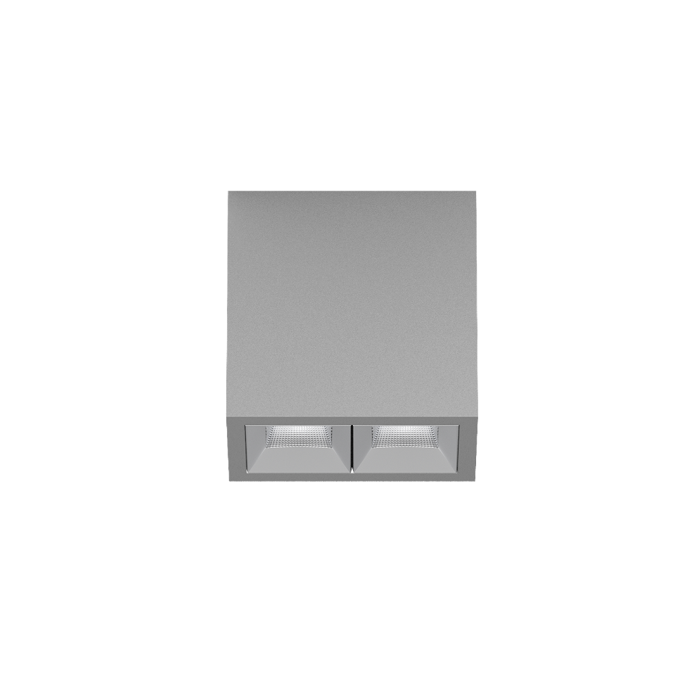 Downlight múltiple de aluminio rectangular de superficie; cuerpo luminoso insertable en la placa de montaje por enclavamiento y sin necesidad de herramienta; convertidor integrado en el cuerpo luminoso; superficie pintada al polvo en aluminio blanco; equipado con dos ópticas wide flood square; distribución de luz simétrica con precisa característica de emisión, ángulo de emisión 71°; reflector de alta calidad con óptica micro-facetada, superficie vaporizada de aluminio; Reflector cromo; refrigeración pasiva de los LEDs por medio de una geometría de cuerpo de refrigeración optimizada; color de luz 4000 K; binning inicialmente MacAdam ≤ 3 SDCM; CRI ≥ 90; mín. 90 % del flujo luminoso después de 50000 h de vida útil; LEDS de alta eficiencia que proporcionan una alta reproducción cromática; grado de protección IP20; CP1; 220-240 V; incluido convertidor DALI-2; fuente luminosa no sustituible; mecanismo de control sustituible por un técnico autorizado; sin reverberación;