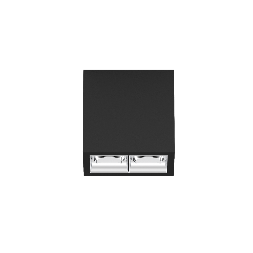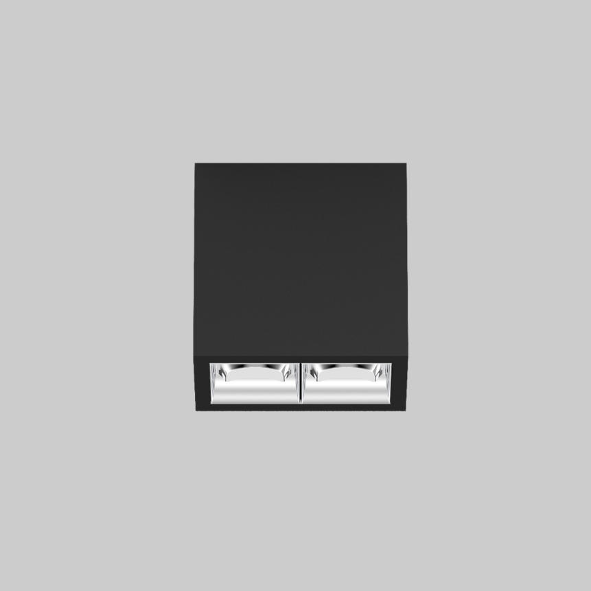 Downlight múltiple de aluminio rectangular de superficie; cuerpo luminoso insertable en la placa de montaje por enclavamiento y sin necesidad de herramienta; convertidor integrado en el cuerpo luminoso; superficie pintada al polvo en negro intenso; equipado con dos ópticas wallwasher; distribución de luz asimétrica con precisa característica de emisión; reflector de alta calidad con óptica micro-facetada, superficie vaporizada de aluminio; Reflector cromo; refrigeración pasiva de los LEDs por medio de una geometría de cuerpo de refrigeración optimizada; color de luz 3000 K; binning inicialmente MacAdam ≤ 3 SDCM; CRI ≥ 90; mín. 90 % del flujo luminoso después de 50000 h de vida útil; LEDS de alta eficiencia que proporcionan una alta reproducción cromática; grado de protección IP20; CP1; 220-240 V; incluido convertidor DALI-2; fuente luminosa no sustituible; mecanismo de control sustituible por un técnico autorizado; sin reverberación;