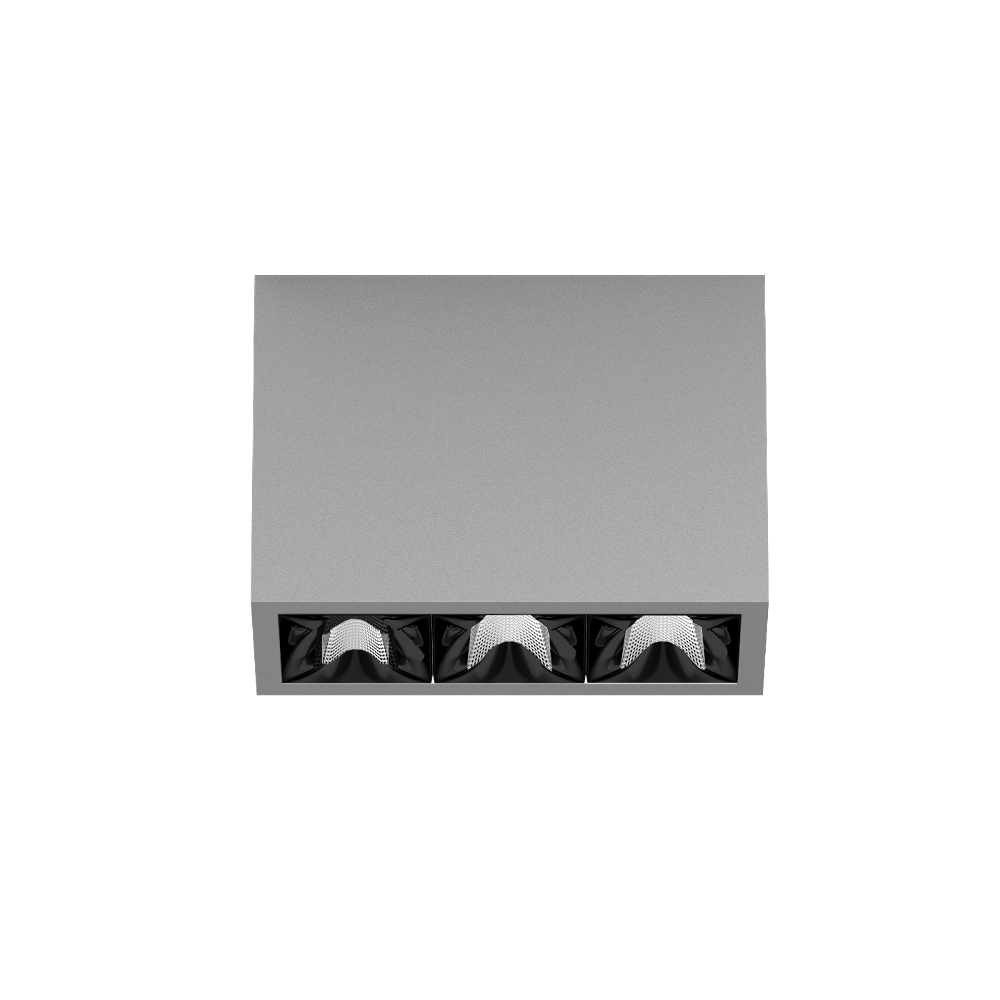 Downlight múltiple de aluminio rectangular de superficie; cuerpo luminoso insertable en la placa de montaje por enclavamiento y sin necesidad de herramienta; convertidor integrado en el cuerpo luminoso; superficie pintada al polvo en aluminio blanco; equipado con tres ópticas flood round; distribución de luz simétrica con precisa característica de emisión, ángulo de emisión 49°; reflector de alta calidad con óptica micro-facetada, superficie vaporizada de aluminio; Reflector negro; UGR ≤ 19; refrigeración pasiva de los LEDs por medio de una geometría de cuerpo de refrigeración optimizada; color de luz 2700 K; ≤ 3 SDCM (initial MacAdam); CRI ≥ 90; mín. 90 % del flujo luminoso después de 50000 h de vida útil; LEDS de alta eficiencia que proporcionan una alta reproducción cromática; grado de protección IP20; CP1; 220-240 V; incluido convertidor DALI-2; fuente luminosa no sustituible; mecanismo de control sustituible por un técnico autorizado; sin reverberación;