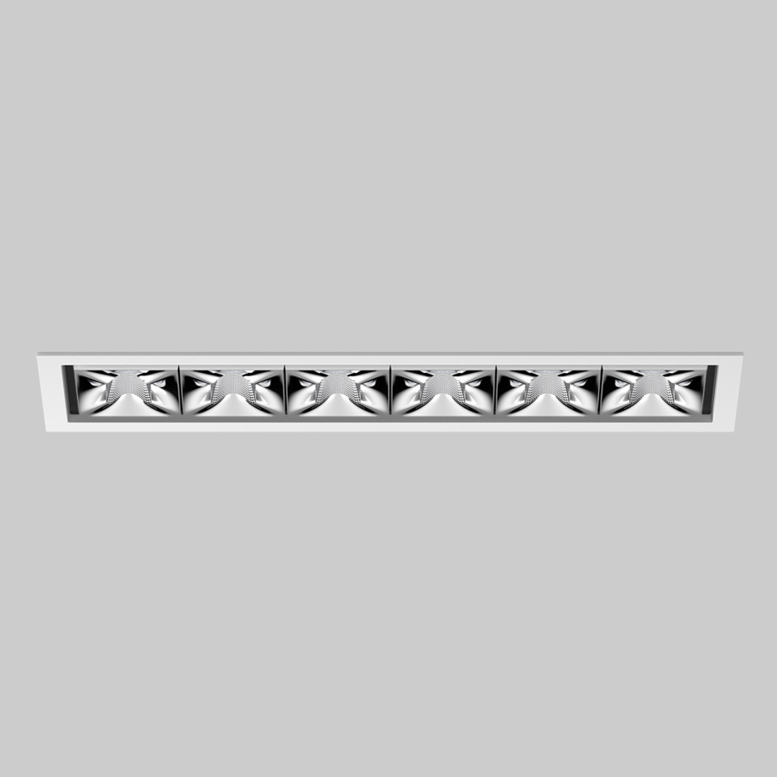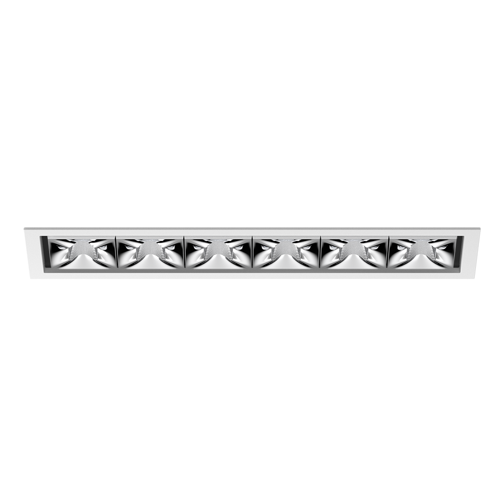 Luz múltiple empotrable descendente rectangular para montar, de aluminio de colada a presión; montaje sin herramientas mediante kit de montaje con sistema de inserción por bola patentado; carcasa de montaje rectangular; con marco blanco tráfico; apropiada para grosores de techo de 2-25 mm; equipado con seis ópticas medium round; distribución de luz simétrica con precisa característica de emisión, ángulo de emisión 33°; reflector de alta calidad con óptica micro-facetada, superficie vaporizada de aluminio; reflector cromo; UGR ≤ 10; lámpara para el puesto de trabajo apta para pantallas según DIN EN 12464-1; luminancia por encima de 65° ≤ 3000 cd/m²; refrigeración pasiva de los LEDs por medio de una geometría de cuerpo de refrigeración optimizada; color de luz 3000 K; ≤ 3 SDCM (initial MacAdam); CRI ≥ 90; mín. 90 % del flujo luminoso después de 50000 h de vida útil; LEDS de alta eficiencia que proporcionan una alta reproducción cromática; grado de protección IP20; CP2; 220-240 V; incluido convertidor DALI-2; caja de conexión para cableado, 3 o 5 pines, disponible como accesorio; el accesorio se menciona por separado; fuente luminosa no sustituible; mecanismo de control sustituible por un técnico autorizado; sin reverberación;