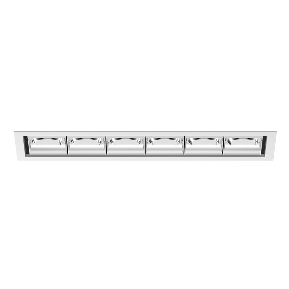 Luz múltiple empotrable descendente rectangular para montar, de aluminio de colada a presión; montaje sin herramientas mediante kit de montaje con sistema de inserción por bola patentado; carcasa de montaje rectangular; con marco blanco tráfico; apropiada para grosores de techo de 2-25 mm; equipado con seis ópticas wallwasher; distribución de luz asimétrica con precisa característica de emisión; reflector de alta calidad con óptica micro-facetada, superficie vaporizada de aluminio; reflector cromo; refrigeración pasiva de los LEDs por medio de una geometría de cuerpo de refrigeración optimizada; color de luz 2700 K; ≤ 3 SDCM (initial MacAdam); CRI ≥ 90; mín. 90 % del flujo luminoso después de 50000 h de vida útil; LEDS de alta eficiencia que proporcionan una alta reproducción cromática; grado de protección IP20; CP2; 220-240 V; incluido convertidor DALI-2; caja de conexión para cableado, 3 o 5 pines, disponible como accesorio; el accesorio se menciona por separado; fuente luminosa no sustituible; mecanismo de control sustituible por un técnico autorizado; sin reverberación;