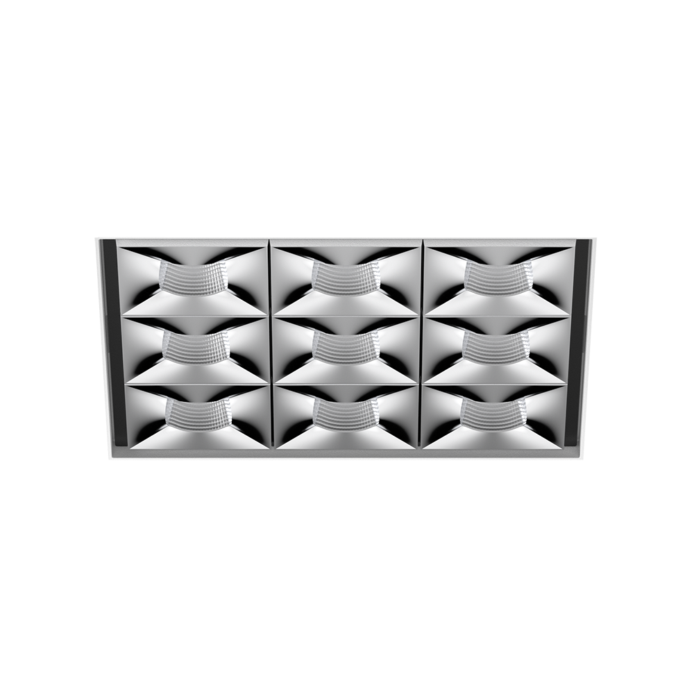 Luz múltiple empotrable descendente cuadrada para montar, de aluminio de colada a presión; montaje sin herramientas mediante kit de montaje con sistema de inserción por bola patentado; carcasa de montaje cuadrada; para montaje sin borde en techos de cartón yeso; para instalación en techos con grosor de 12,5/15/20/25 mm; equipado con nueve ópticas medium square; distribución de luz simétrica con precisa característica de emisión, ángulo de emisión 32°; reflector de alta calidad con óptica micro-facetada, superficie vaporizada de aluminio; reflector cromo; UGR ≤ 10; lámpara para el puesto de trabajo apta para pantallas según DIN EN 12464-1; luminancia por encima de 65° ≤ 3000 cd/m²; refrigeración pasiva de los LEDs por medio de una geometría de cuerpo de refrigeración optimizada; color de luz 3000 K; binning inicialmente MacAdam ≤ 3 SDCM; CRI ≥ 90; mín. 90 % del flujo luminoso después de 50000 h de vida útil; LEDS de alta eficiencia que proporcionan una alta reproducción cromática; grado de protección IP20; CP2; 220-240 V; incluido convertidor, no regulable; caja de conexión para cableado, 3 o 5 pines, disponible como accesorio; el accesorio se menciona por separado; fuente luminosa no sustituible; mecanismo de control sustituible por un técnico autorizado; sin reverberación;