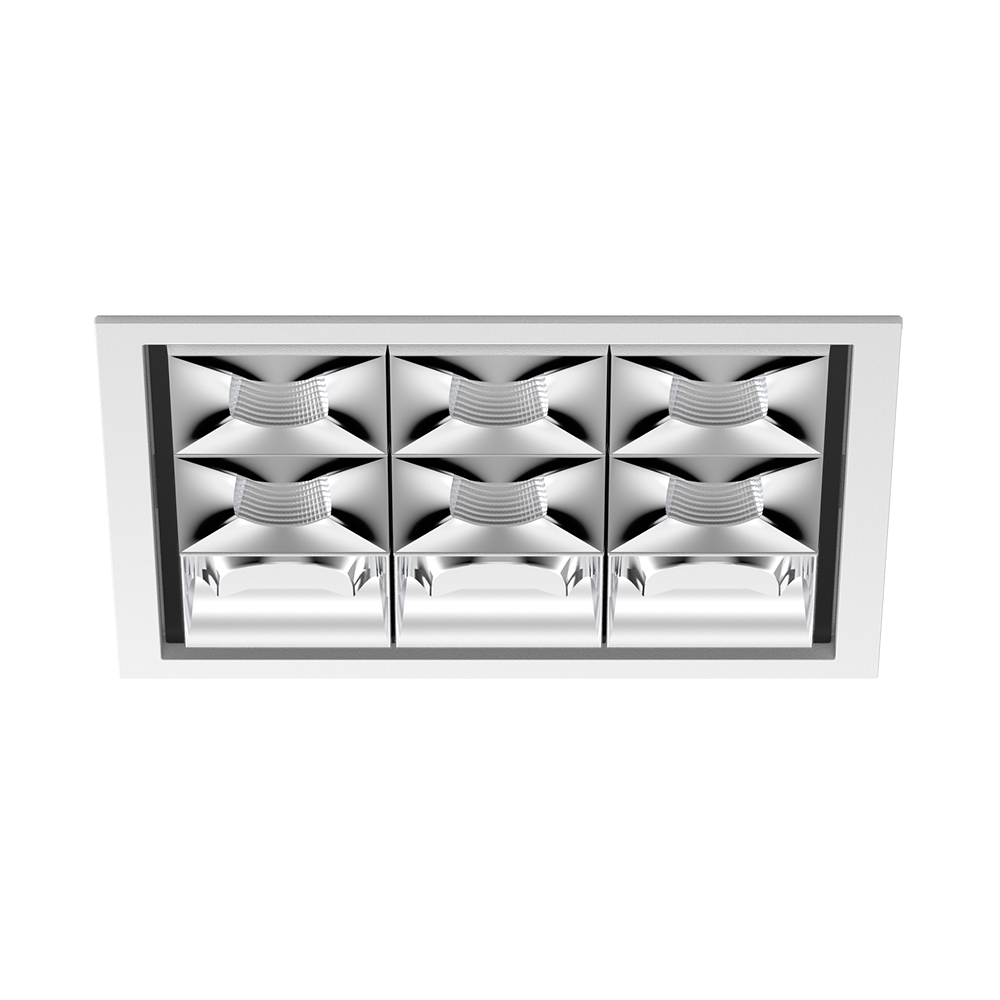 Luz múltiple empotrable descendente cuadrada para montar, de aluminio de colada a presión; montaje sin herramientas mediante kit de montaje con sistema de inserción por bola patentado; carcasa de montaje cuadrada; con marco blanco tráfico; apropiada para grosores de techo de 2-25 mm; equipado con tres ópticas wallwasher + seis ópticas flood square; proyección precisa de la luz; reflector de alta calidad con óptica micro-facetada, superficie vaporizada de aluminio; reflector cromo; refrigeración pasiva de los LEDs por medio de una geometría de cuerpo de refrigeración optimizada; color de luz 3000 K; binning inicialmente MacAdam ≤ 3 SDCM; CRI ≥ 90; mín. 90 % del flujo luminoso después de 50000 h de vida útil; LEDS de alta eficiencia que proporcionan una alta reproducción cromática; grado de protección IP20; CP2; 220-240 V; incluido convertidor, no regulable; caja de conexión para cableado, 3 o 5 pines, disponible como accesorio; el accesorio se menciona por separado; fuente luminosa no sustituible; mecanismo de control sustituible por un técnico autorizado; sin reverberación;