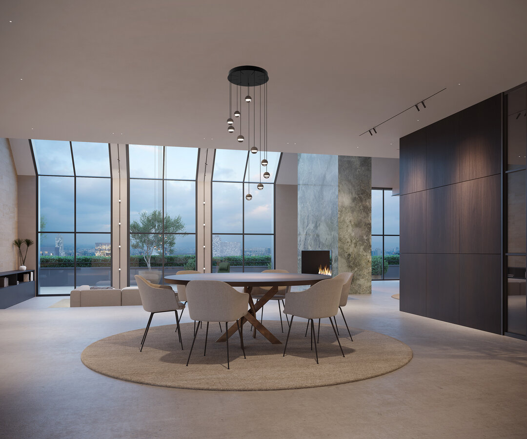 Luminaria suspendida decorativa fabricada en aluminio; superficie de cromo pulido, aluminio cepillado o recubierta por pulverización; suspendido con pendular, incl. cable de alimentación (negro o blanco); se puede acortar; base de techo redonda (blanca o negra) de montaje en superficie para la instalación de dos a cinco o de dos a diez lámparas; o base de techo lineal (blanca o negra) de montaje en superficie para la instalación de dos a cinco lámparas; lente de cristal plano-convexa alta calidad; LEDS de alta eficiencia que proporcionan una alta reproducción cromática; baldaquino para cableado pasante; convertidor integrado en el baldaquino; anillos de montaje en techo disponibles opcionalmente para el posicionamiento múltiple de la luminaria en la sala