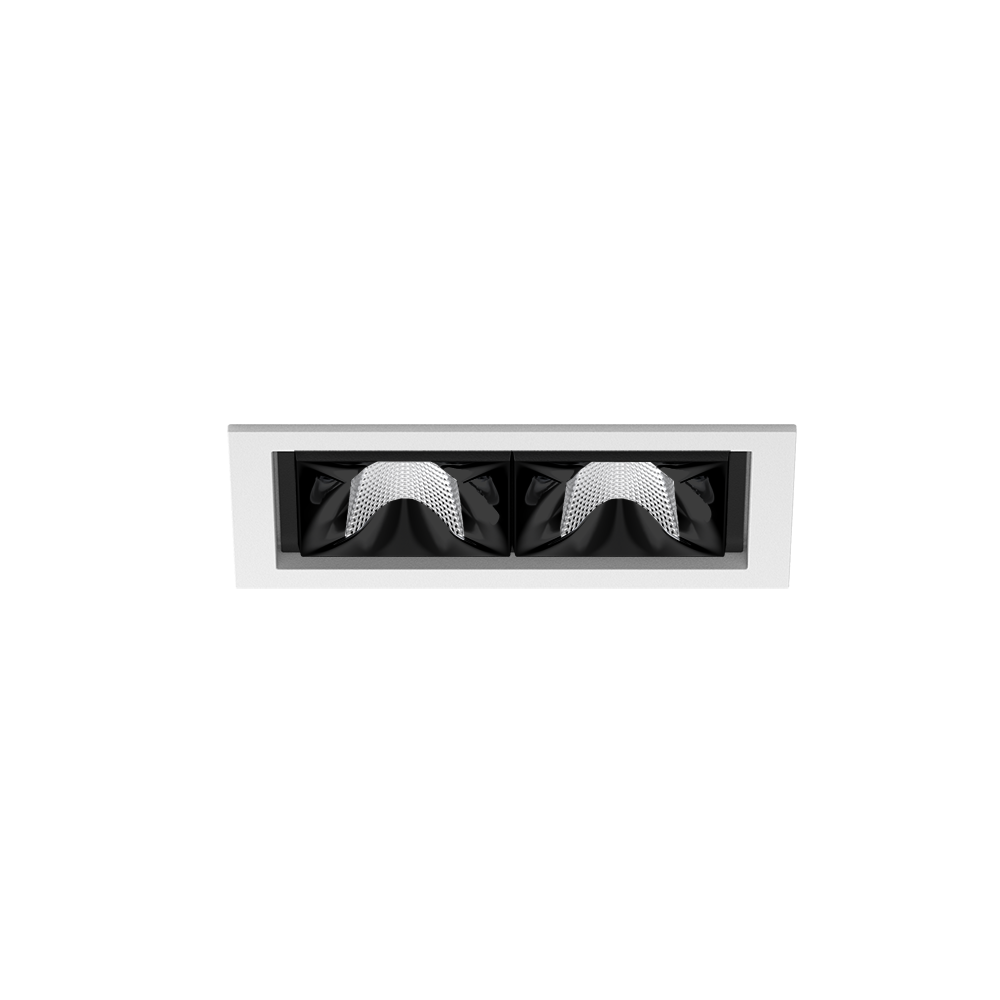 Multi-Downlight rectangulaire en aluminium moulé sous pression pour encastrement ; montage sans outils en kit de montage grâce à un système breveté de loquet à billes ; boîtier à encastrer rectangulaire ; avec bord continu blanc signalisation ; approprié pour une épaisseur de plafond de 2-25 mm ; équipé de deux optiques flood round ; répartition symétrique de la lumière avec caractéristique d'émission précise, angle de rayonnement 49° ; réflecteur de haute qualité avec surface à micro-facettes vaporisée d'aluminium ; réflecteur noir ; UGR ≤ 16 ; luminaire d'éclairage de poste de travail adapté au travail sur écran selon DIN EN 12464-1 ; luminance supérieure à 65° ≤ 3000 cd / m² ; refroidissement passif des LED par géométrie optimisée du radiateur ; couleur de lumière 3000 K ; binning initialement MacAdam ≤ 3 SDCM ; CRI ≥ 90 ; min. 90 % du flux lumineux au bout de 50000 h de durée de vie ; High-Power-LED à grande efficacité énergétique, très bon rendu des couleurs ; indice de protection IP20 ; CP2 ; 220-240 V ; convertisseur DALI-2 inclus ; boîtier de raccordement pour câblage ultérieur, 3 ou 5 bornes, disponible comme accessoire ; accessoires présentés séparément ; source lumineuse non remplaçable ; dispositif de commande remplaçable par un professionnel agréé ; sans distorsions ;
