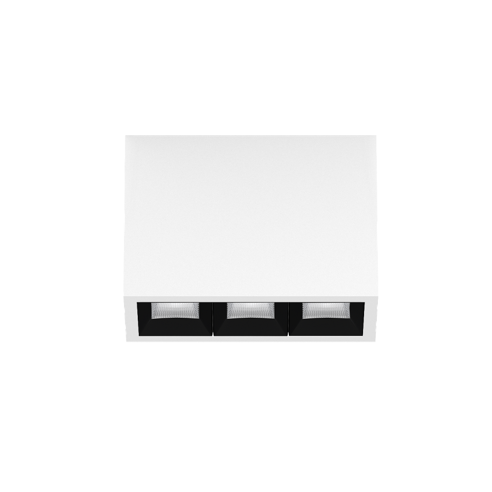 Multi-downlight apparent rectangulaire, en aluminium ; corps de luminaire pouvant être monté sans outils sur la plaque de montage grâce à un système de verrouillage ; convertisseur intégré dans le corps de luminaire ; surface thermolaquée blanc signalisation ; équipé de trois optiques wide flood square ; répartition symétrique de la lumière avec caractéristique d'émission précise, angle de rayonnement 71° ; réflecteur de haute qualité avec surface à micro-facettes vaporisée d'aluminium ; Réflecteur noir ; refroidissement passif des LED par géométrie optimisée du radiateur ; couleur de lumière 3000 K ; ≤ 3 SDCM (initial MacAdam) ; CRI ≥ 90 ; min. 90 % du flux lumineux au bout de 50000 h de durée de vie ; High-Power-LED à grande efficacité énergétique, très bon rendu des couleurs ; indice de protection IP20 ; CP1 ; 220-240 V ; convertisseur DALI-2 inclus ; source lumineuse non remplaçable ; dispositif de commande remplaçable par un professionnel agréé ; sans distorsions ;