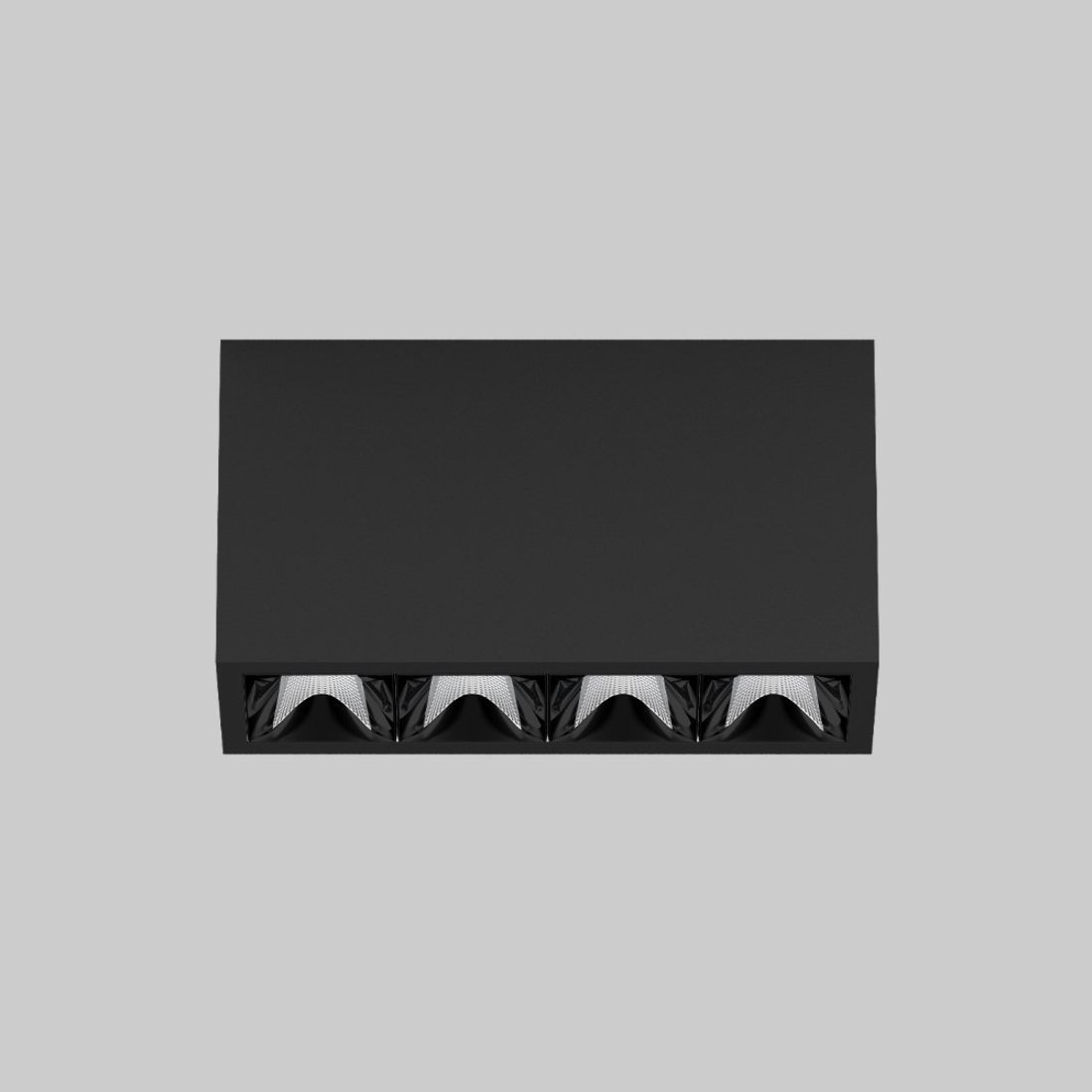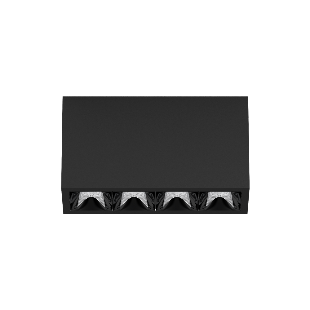 Multi-downlight apparent rectangulaire, en aluminium ; corps de luminaire pouvant être monté sans outils sur la plaque de montage grâce à un système de verrouillage ; convertisseur intégré dans le corps de luminaire ; surface thermolaquée noir profond ; équipé de quatre optiques wide flood round ; répartition symétrique de la lumière avec caractéristique d'émission précise, angle de rayonnement 72° ; réflecteur de haute qualité avec surface à micro-facettes vaporisée d'aluminium ; Réflecteur noir ; refroidissement passif des LED par géométrie optimisée du radiateur ; couleur de lumière 4000 K ; ≤ 3 SDCM (initial MacAdam) ; CRI ≥ 90 ; min. 90 % du flux lumineux au bout de 50000 h de durée de vie ; High-Power-LED à grande efficacité énergétique, très bon rendu des couleurs ; indice de protection IP20 ; CP1 ; 220-240 V ; convertisseur inclus, non dimmable ; source lumineuse non remplaçable ; dispositif de commande remplaçable par un professionnel agréé ; sans distorsions ;