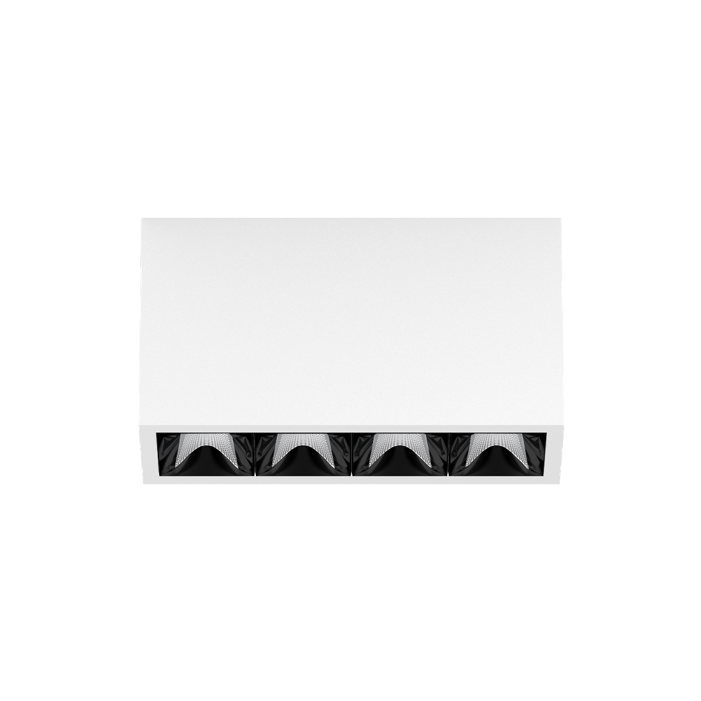 Multi-downlight apparent rectangulaire, en aluminium ; corps de luminaire pouvant être monté sans outils sur la plaque de montage grâce à un système de verrouillage ; convertisseur intégré dans le corps de luminaire ; surface thermolaquée blanc signalisation ; équipé de quatre optiques wide flood round ; répartition symétrique de la lumière avec caractéristique d'émission précise, angle de rayonnement 72° ; réflecteur de haute qualité avec surface à micro-facettes vaporisée d'aluminium ; Réflecteur noir ; refroidissement passif des LED par géométrie optimisée du radiateur ; couleur de lumière 2700 K ; binning initialement MacAdam ≤ 3 SDCM ; CRI ≥ 90 ; min. 90 % du flux lumineux au bout de 50000 h de durée de vie ; High-Power-LED à grande efficacité énergétique, très bon rendu des couleurs ; indice de protection IP20 ; CP1 ; 220-240 V ; convertisseur DALI-2 inclus ; source lumineuse non remplaçable ; dispositif de commande remplaçable par un professionnel agréé ; sans distorsions ;